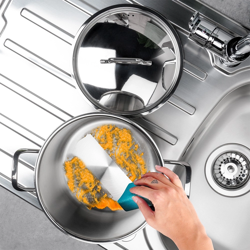 Des parois robustes et épaisses en acier inoxydable 18/10 garantissent une longue durée de vie, une résistance à la corrosion et un nettoyage facile sans retenir les odeurs.
