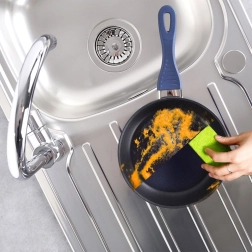 La finition bleue du corps et de la poignée ergonomique à surface silicone apporte du style à la cuisine et assure une prise sûre et confortable. La poêle résiste à la corrosion chimique causée par les détergents et peut être lavée au lave‑vaisselle. Produit original de la marque tchèque ORION, fabriqué conformément aux normes européennes.