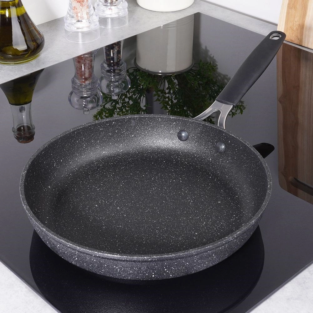 Découvrez une poêle fiable avec revêtement granit pour des steaks, œufs et légumes impeccables. Le corps massif en aluminium moulé avec finition pierre multicouche garantit un chauffage rapide et uniforme et une excellente antiadhérence sans PFOA ni PTFE. Grâce à ses bords plus hauts, elle est idéale autant pour saisir que pour mijoter et réduire les sauces.