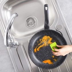 Le revêtement granit spécial sans PFOA ni PTFE permet de cuisiner avec un minimum d’huile, assure un démoulage facile des aliments et un nettoyage rapide. Le fond à induction répartit efficacement la chaleur, économise l’énergie et maintient une température stable pour la cuisson à la poêle comme à l’étouffée.
