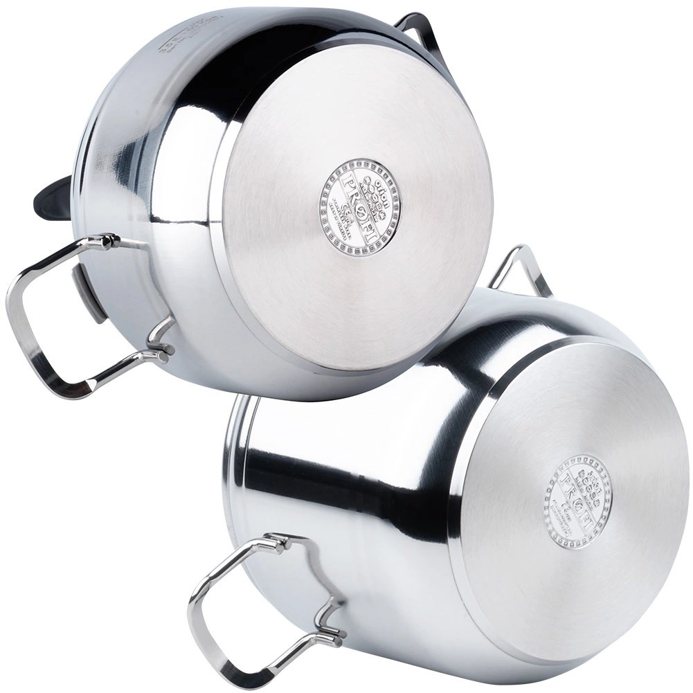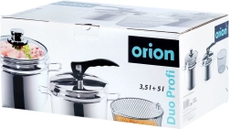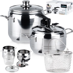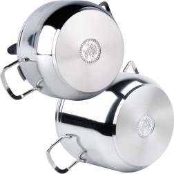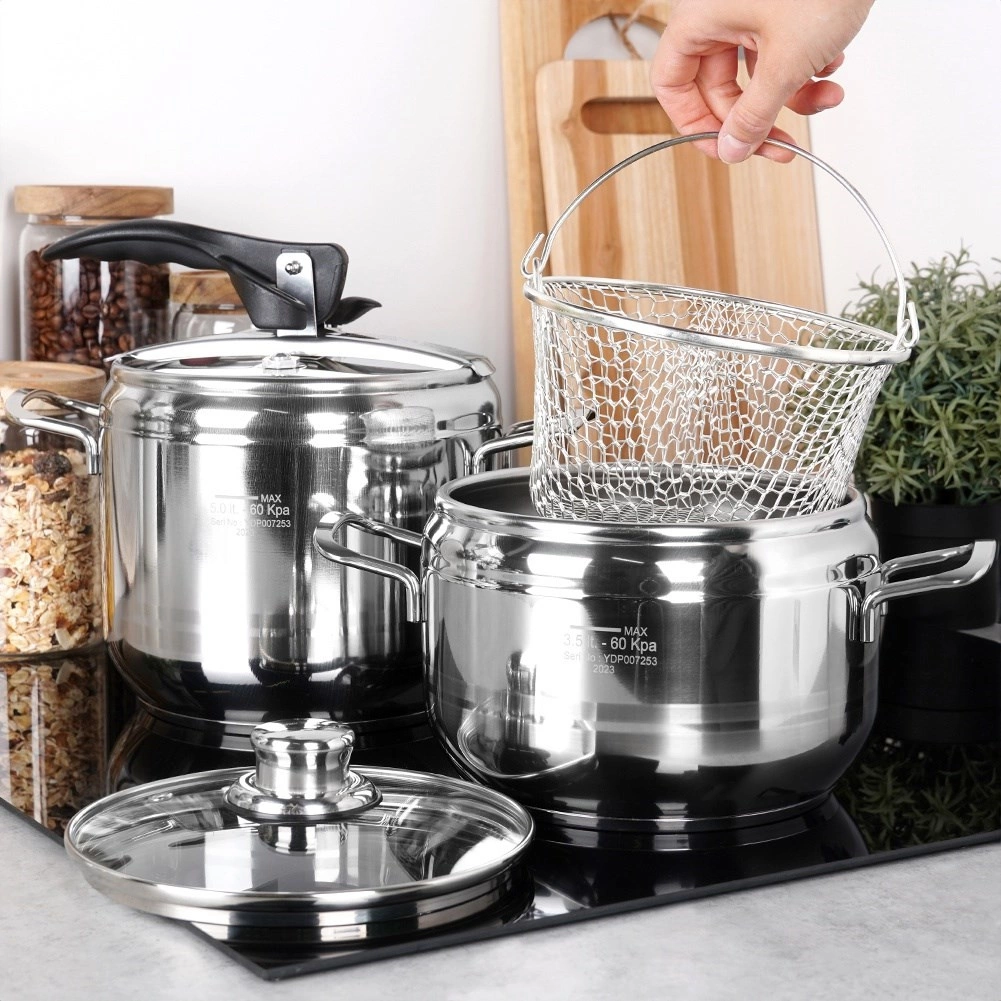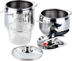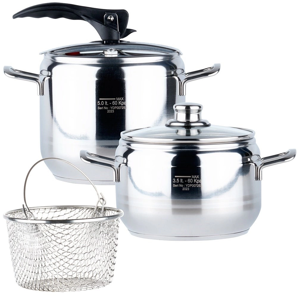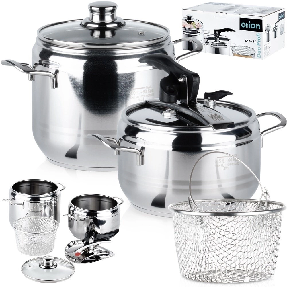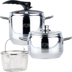 Ensemble pratique de deux autocuiseurs en acier inoxydable de 3,5 et 5 l, à usage universel pour tous les types de plaques, y compris l’induction. Inclus: couvercle sous pression, couvercle en verre et panier métallique pour cuire, égoutter ou frire. Le fond 3 couches épais assure une diffusion uniforme de la chaleur, tandis que 2 soupapes de sécurité et la régulation de la pression apportent une tranquillité d’esprit pendant la cuisson. Grâce à la cuisson sous pression, la casserole est rapide et économe en énergie et, sans couvercle, elle se nettoie facilement au lave-vaisselle.