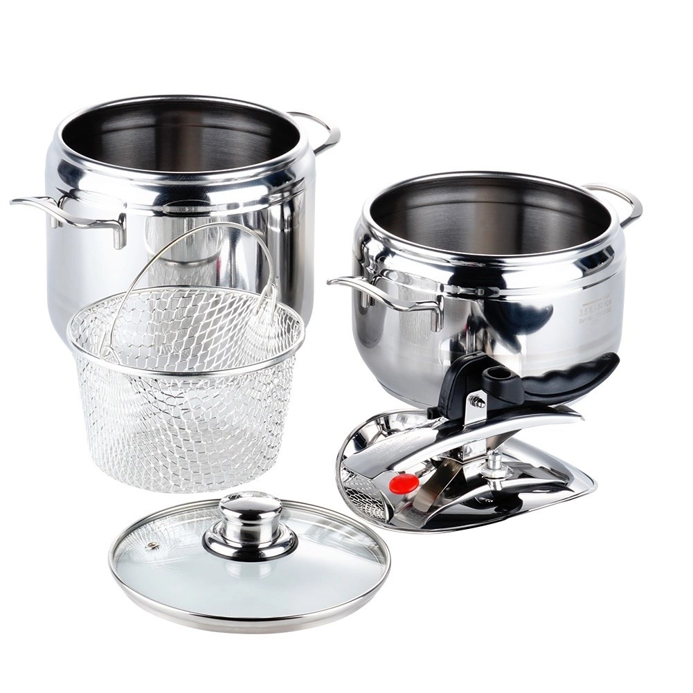 - 2x autocuiseur (3,5 l et 5 l), 1x couvercle sous pression, 1x couvercle en verre, 1x panier métallique