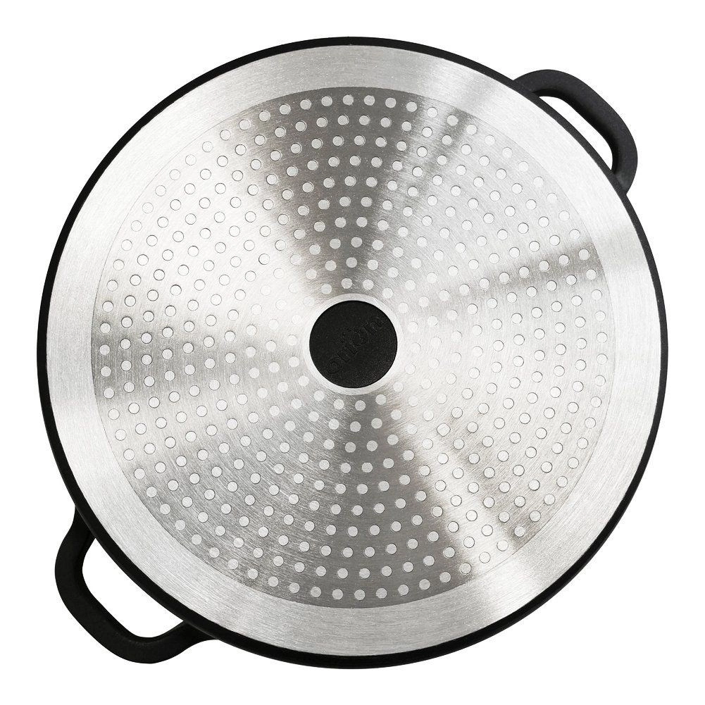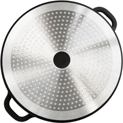 Le couvercle doté d’un bord en inox et d’une valve permet de contrôler la cuisson et d’évacuer la vapeur en toute sécurité.