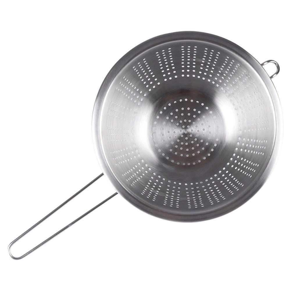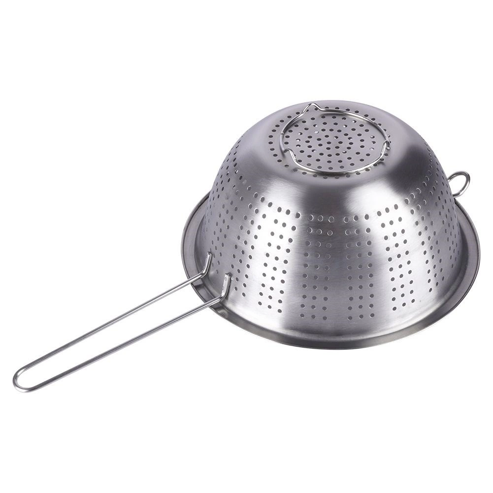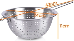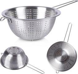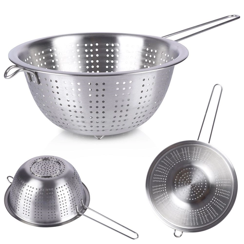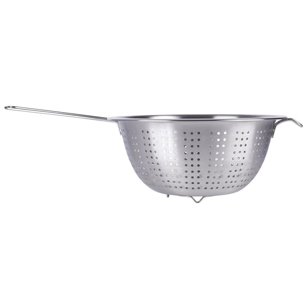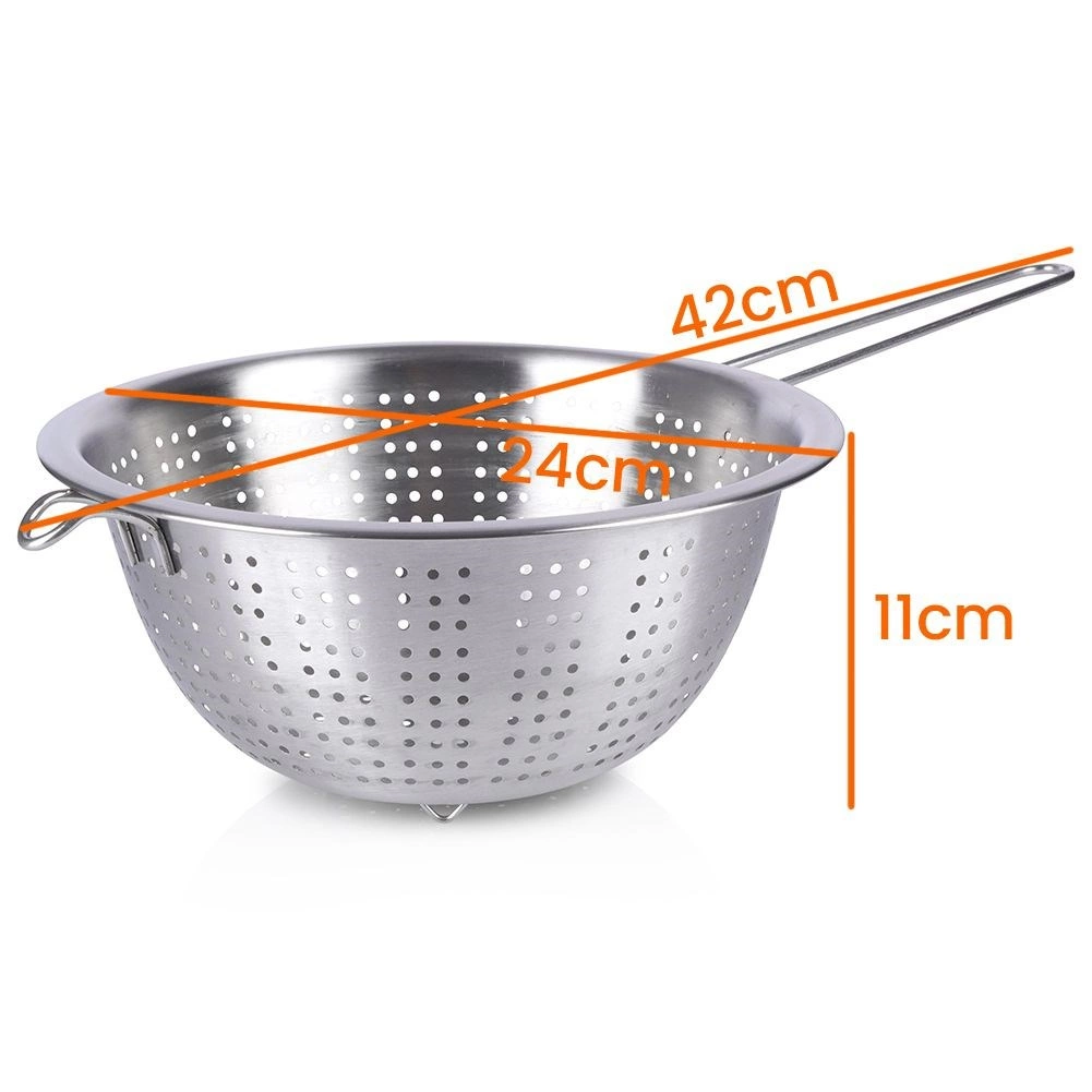 Passoire pratique en acier inoxydable de 24 cm de diamètre avec longue poignée et pieds stables, idéale pour les tâches quotidiennes en cuisine. Parfaite pour égoutter les pâtes, rincer les fruits et légumes ainsi que le riz. Grâce à l’acier inoxydable de qualité, elle est robuste, facile à nettoyer et offre une prise en main confortable avec possibilité de suspension.