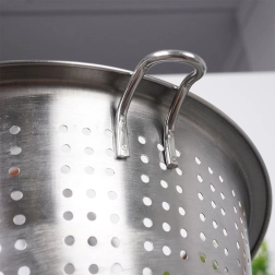 Les pieds maintiennent fermement la passoire en place, et la perforation dense assure un écoulement rapide de l’eau lors de l’égouttage des pâtes, des légumes et des fruits.
