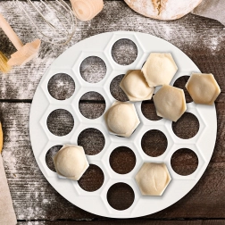 Le moule accélère le découpage et le façonnage, maintient une taille uniforme et convient aux garnitures sucrées comme salées. Il est utile non seulement pour les pelmeni, raviolis ou mini pierogi, mais aussi pour des biscuits et petites pâtisseries de forme ronde. Le matériau est sans danger pour le contact alimentaire et conforme aux normes européennes.