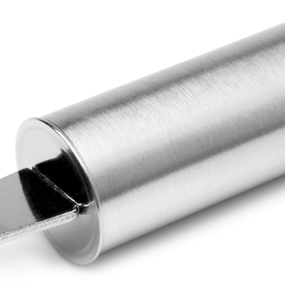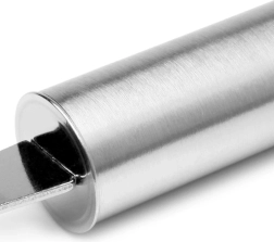Poignée cylindrique ergonomique pour une prise en main sûre, avec œillet terminal pour l’accrocher à la barre de cuisine.
