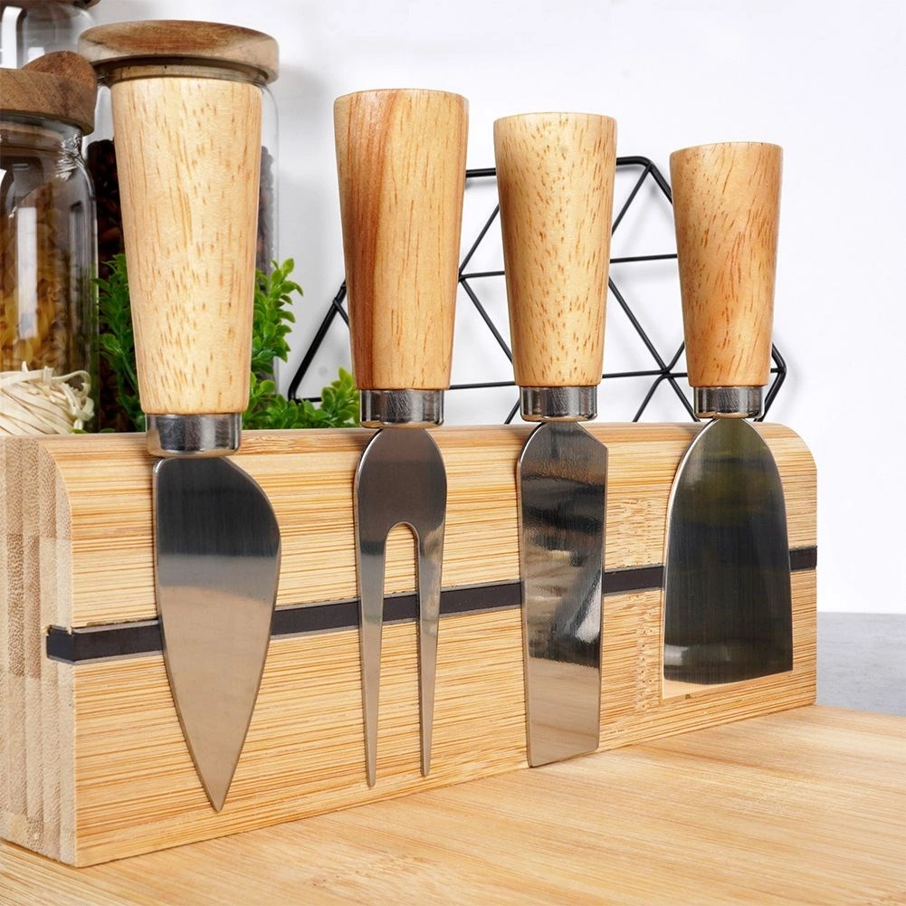 Élégante planche à fromage en bambou avec support magnétique intégré et quatre outils en acier inoxydable, idéale pour un service quotidien comme festif. Elle offre une base antidérapante stable, un rangement compact des couteaux et des matériaux durables pour couper, portionner et servir facilement différents types de fromages.