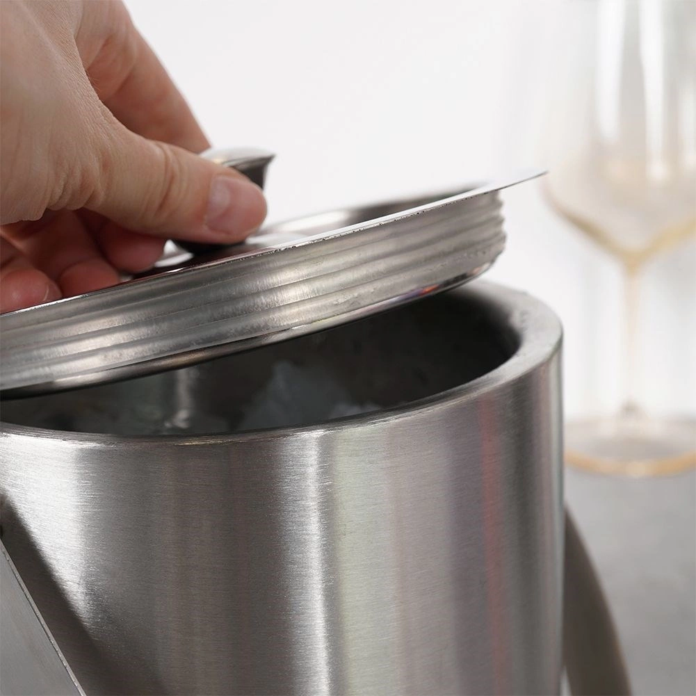Élégant et robuste, ce seau à glace en acier inoxydable brossé garde les cubes de glace parfaitement frais plus longtemps. Grâce à son isolation à double paroi, il fonctionne comme un seau isotherme et ralentit la fonte. Il est équipé d’un couvercle ajusté avec prise et d’une anse rabattable pour un transport confortable.