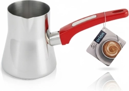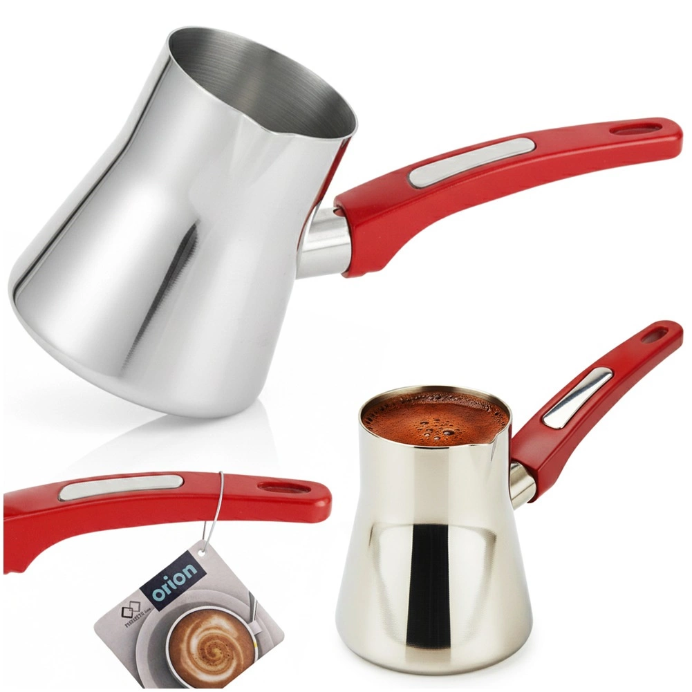 Pratique cafetière turque en acier inoxydable de 330 ml avec poignée ergonomique rouge et bec verseur. Compatible avec les plaques gaz, électriques et vitrocéramiques, idéale aussi pour le chauffage du lait. Fabriquée en acier inoxydable de qualité, sans danger pour les aliments, lavable au lave-vaisselle et dotée d’un rebord anti-gouttes spécial contre les débordements.