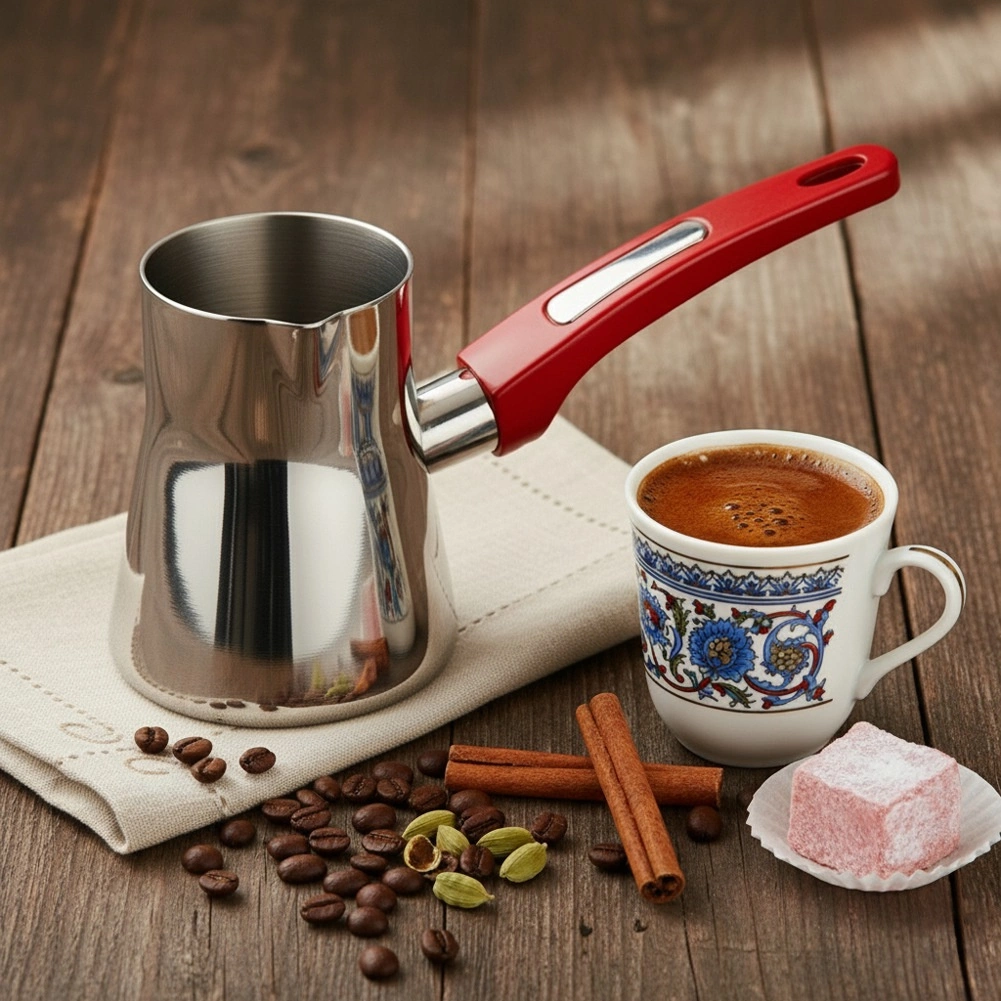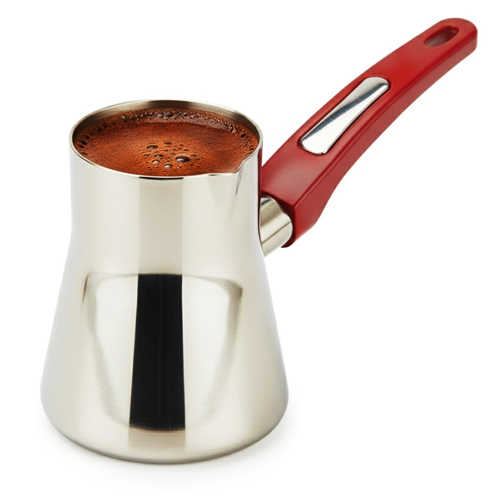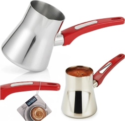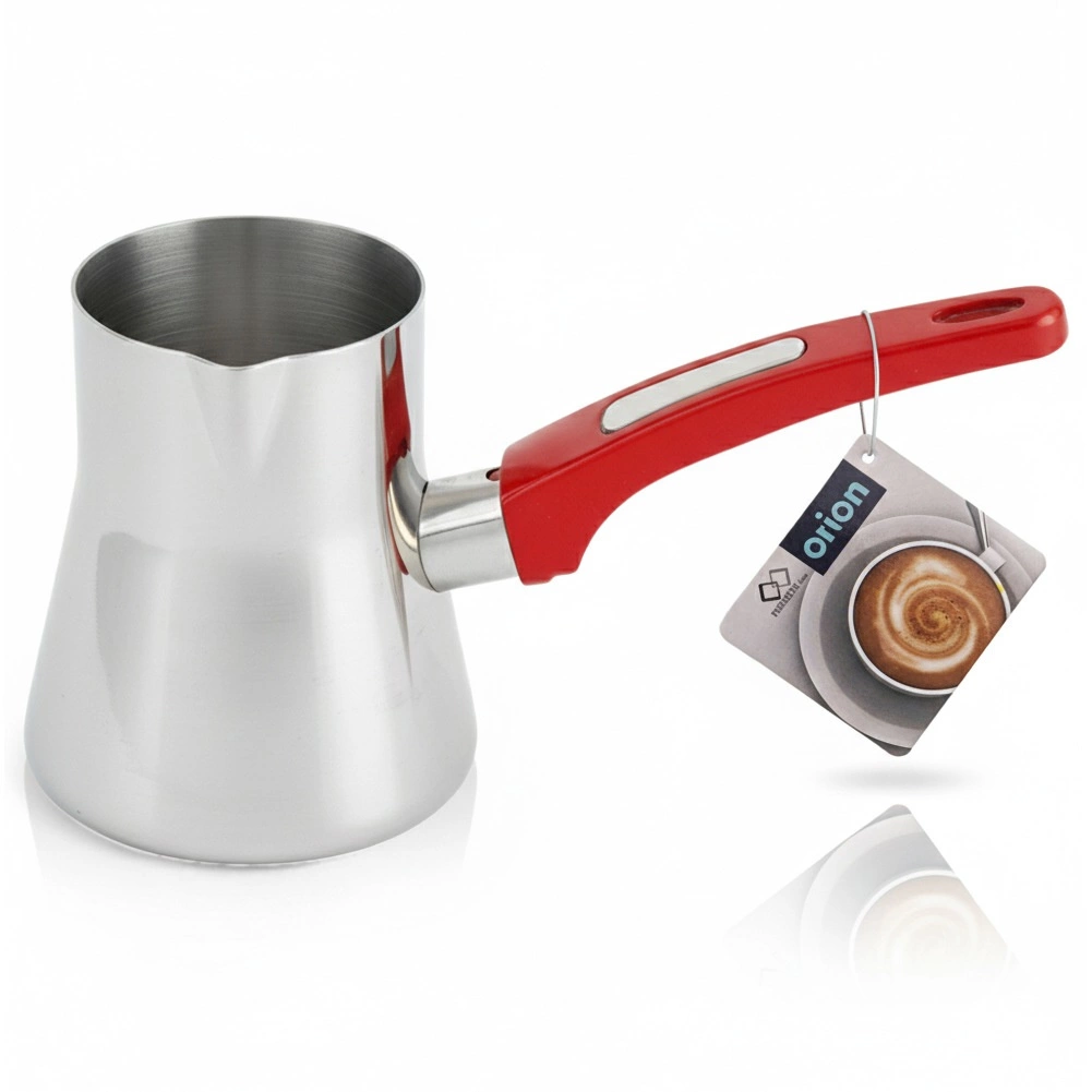 Cette élégante petite cafetière (cezve/ibrik) en acier inoxydable est indispensable pour préparer un café turc authentique. Sa capacité de 330 ml est idéale pour une à deux portions, le bec pratique garantit un versement précis sans renversement et la poignée ergonomique rouge offre une prise en main sûre et confortable.