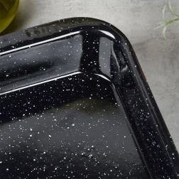 Pratique plat rectangulaire en acier émaillé de qualité d’un volume de 3 l et de dimensions 35,5 × 24 × 5 cm, idéal pour la cuisson des viandes, des légumes, des tartes et pizza maison. L’émail résistant est sans danger pour la santé et convient aux personnes allergiques, les aliments n’attachent pas et le nettoyage est facile – y compris au lave-vaisselle. Convient aux fours à gaz et électriques.