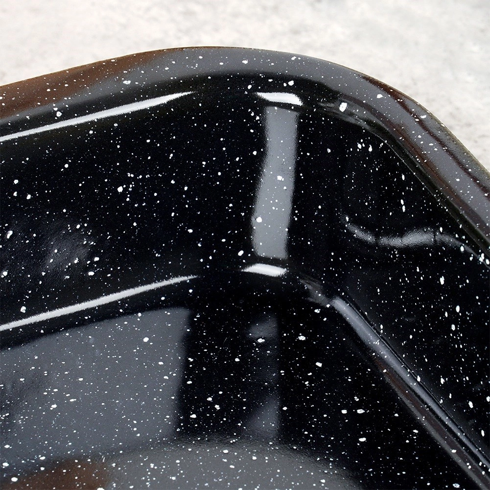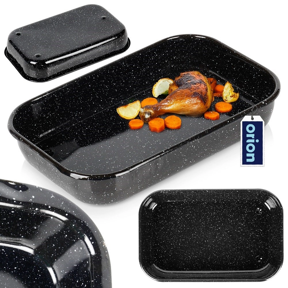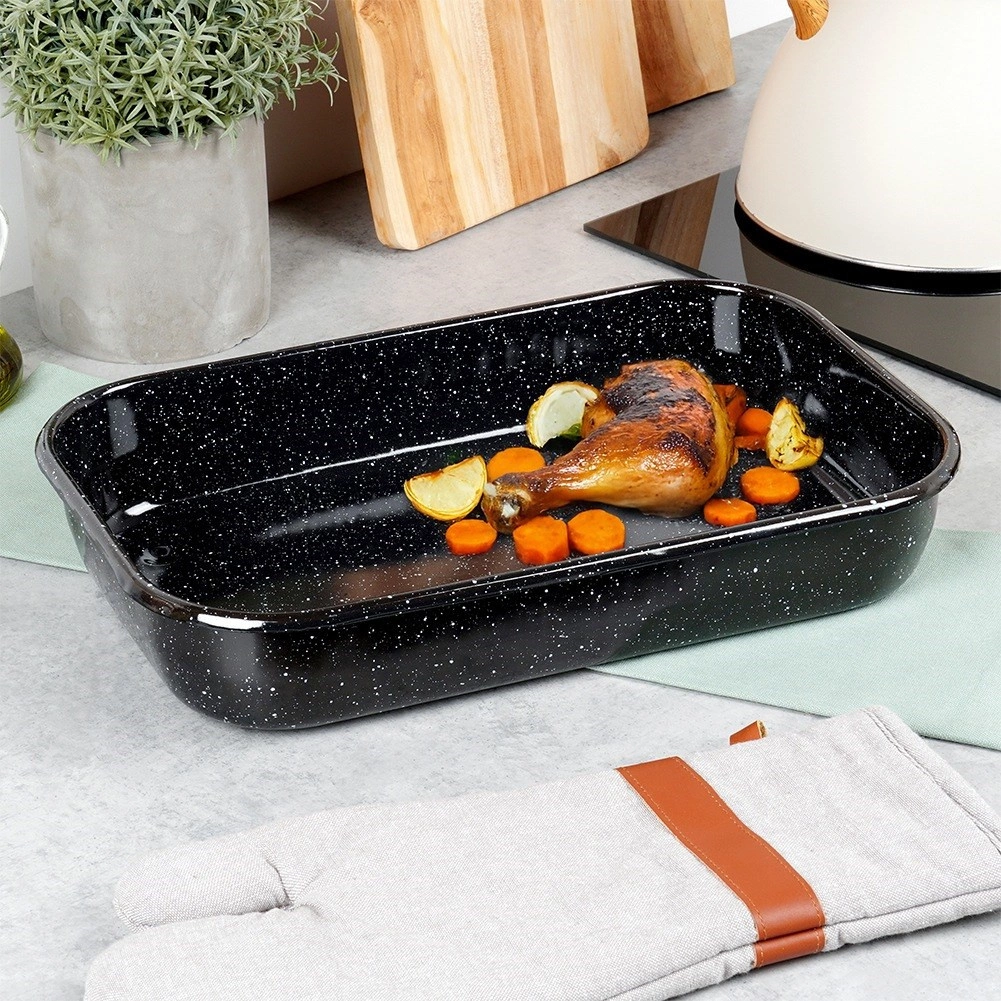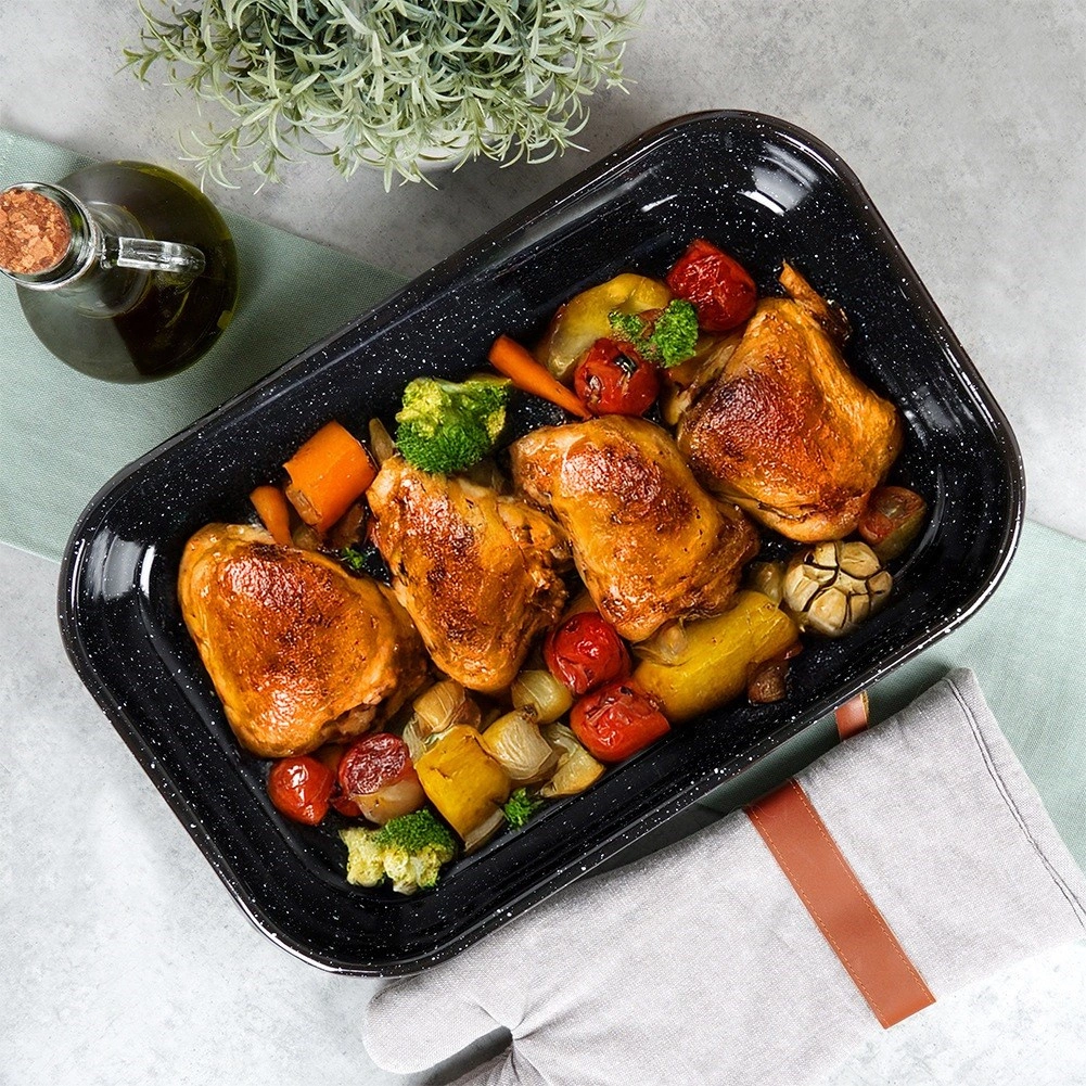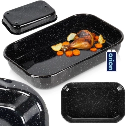 Le plat à rôtir rectangulaire en acier émaillé est durable, hygiénique et offre une excellente conduction de la chaleur pour une cuisson uniforme. L’émail est respectueux de la santé et adapté aux personnes allergiques. Grâce à ses dimensions universelles 38 × 24,5 × 7 cm (intérieur 36 × 22,5 × 6 cm), il convient pour rôtir la viande, les légumes, les gratins et les desserts.