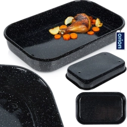 Plat à rôtir émaillé robuste de 42 × 27 × 7 cm (intérieur 39 × 25 × 7 cm), un excellent choix pour la cuisine et la pâtisserie au quotidien. La surface émaillée est hygiénique, durable et convient également aux allergiques. Les bords hauts assurent une cuisson uniforme et offrent assez d’espace pour les jus et garnitures.