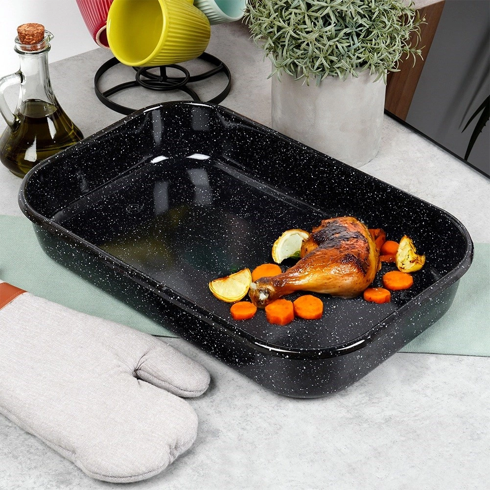 Parfait pour rôtir poulet, porc, poisson, ainsi que gratin de légumes, pizza maison ou gâteaux. Grâce au glaçage lisse, les aliments accrochent moins et le plat se lave facilement au lave-vaisselle.