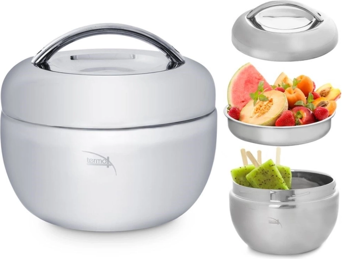 Pratique bol thermique pour aliments en acier inoxydable de qualité, d’un volume de 1 litre, qui maintient vos plats chauds jusqu’à 2 heures ou, au contraire, frais plus longtemps. Il se compose de trois parties – bol extérieur, bol/assiette intérieur(e) et couvercle avec poignée confortable. Idéal pour le travail, les voyages et la maison.