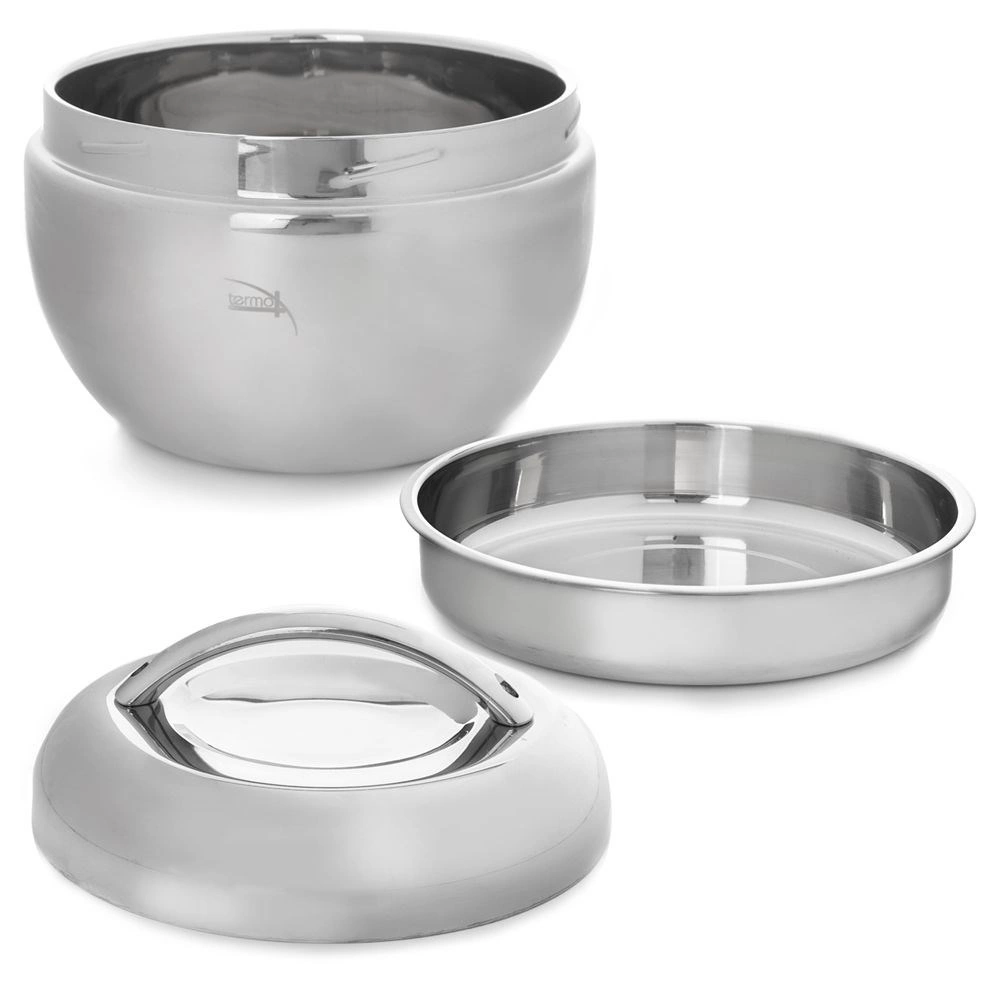 Le bol thermique est léger, résistant et conçu pour une utilisation quotidienne. Grâce à sa construction double, il aide à maintenir la température stable des plats servis – soupes, accompagnements et desserts. En été, vous pouvez aussi l’utiliser pour servir des glaces sans fonte rapide. La surface inox lisse est facile à nettoyer et hygiénique.