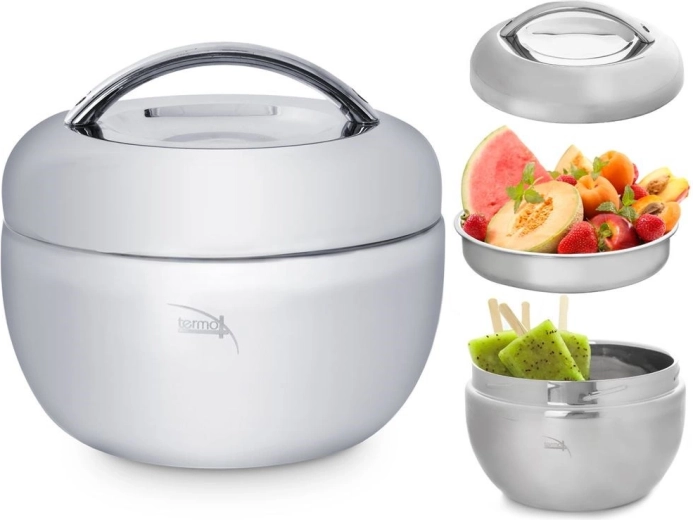 Pratique thermos alimentaire en acier inoxydable d’une capacité de 2 l qui maintient vos plats chauds ou froids plus longtemps. Il se compose d’un bol principal, d’un bol/assiette intérieur et d’un couvercle avec poignée confortable. Grâce à sa fabrication de qualité, il est résistant, facile à transporter et conserve parfaitement la température jusqu’à 2 heures. Idéal pour le travail, les voyages et le service à la maison.