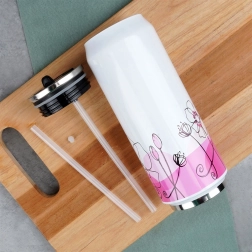 Découvrez un gobelet isotherme moderne et pratique en forme de canette, qui associe un design blanc élégant avec un motif floral rose et une fonctionnalité de pointe. La double paroi avec isolation sous vide maintient la température idéale de votre boisson pendant de longues heures, tandis que l’acier inoxydable garantit une longue durée de vie et une résistance à un usage quotidien.