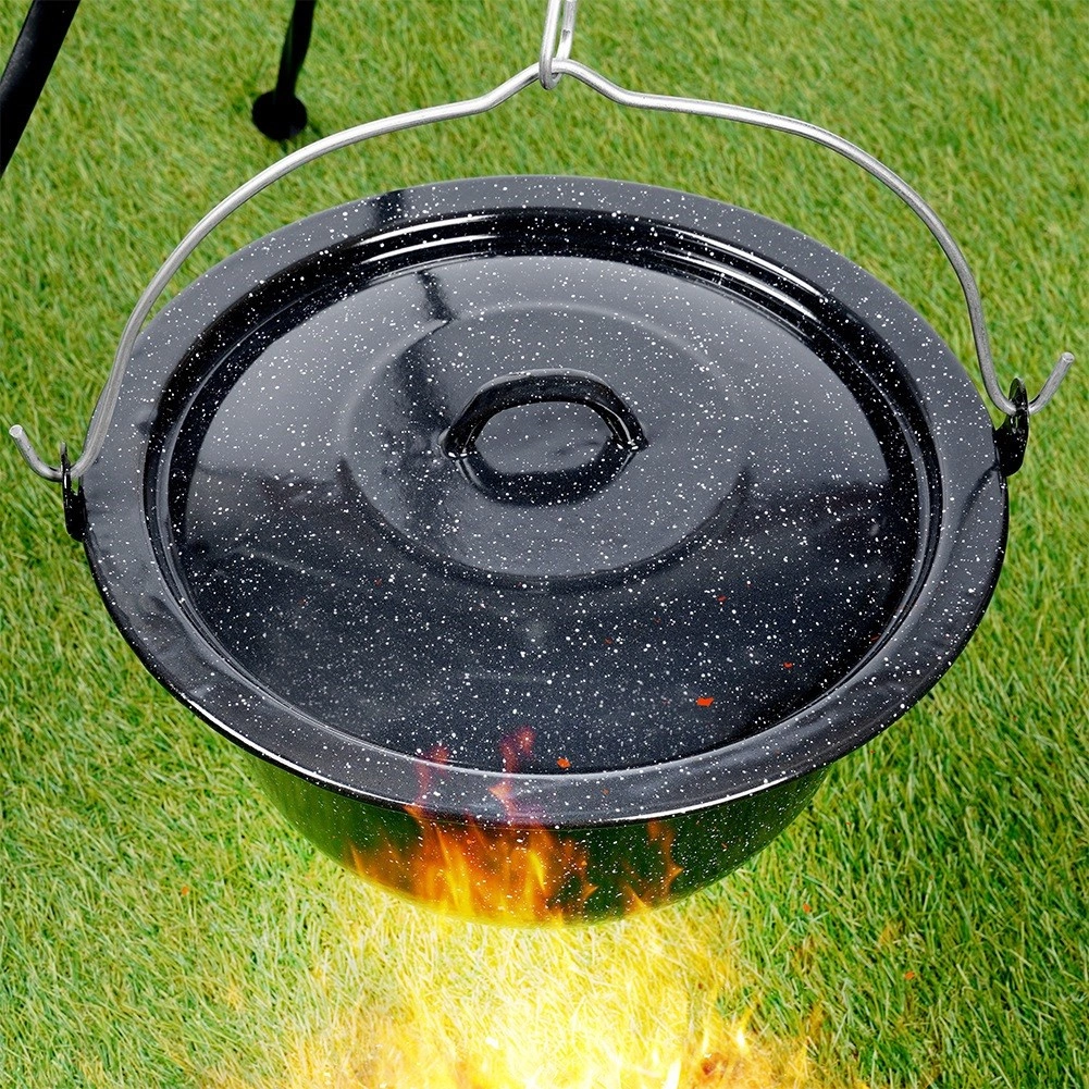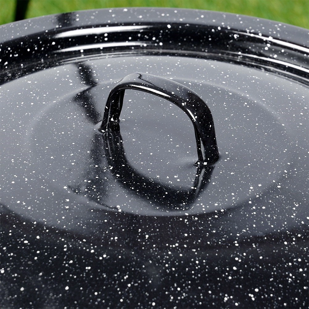 Le couvercle robuste en acier émaillé moucheté noir est idéal pour cuisiner en plein air ou au jardin. Il retient la chaleur et l’humidité dans le chaudron, accélère l’ébullition et améliore le goût des soupes, goulaschs et plats mijotés. Convient aux chaudrons hongrois de 13 l (diamètre 40 cm).