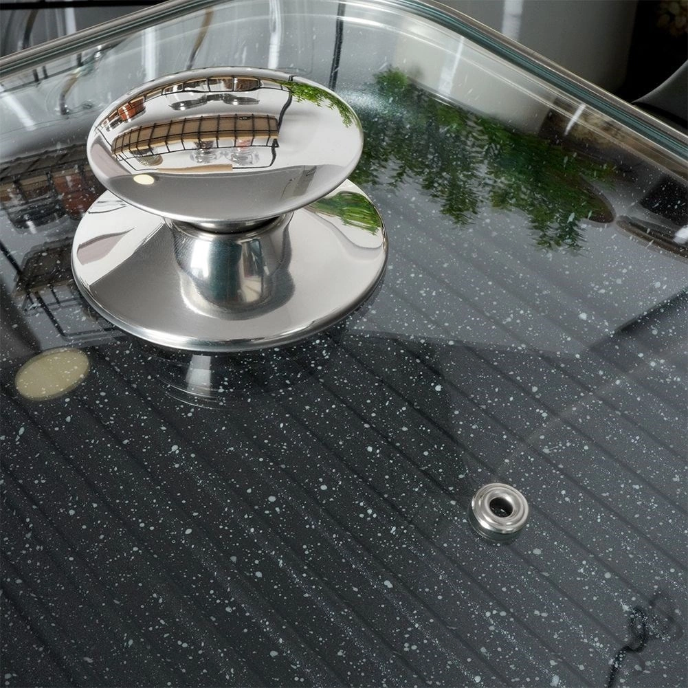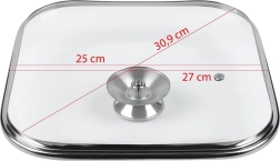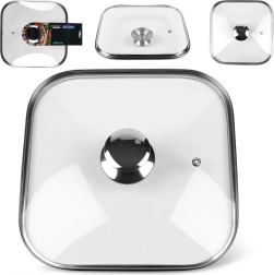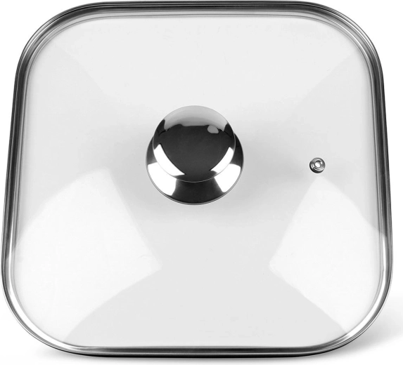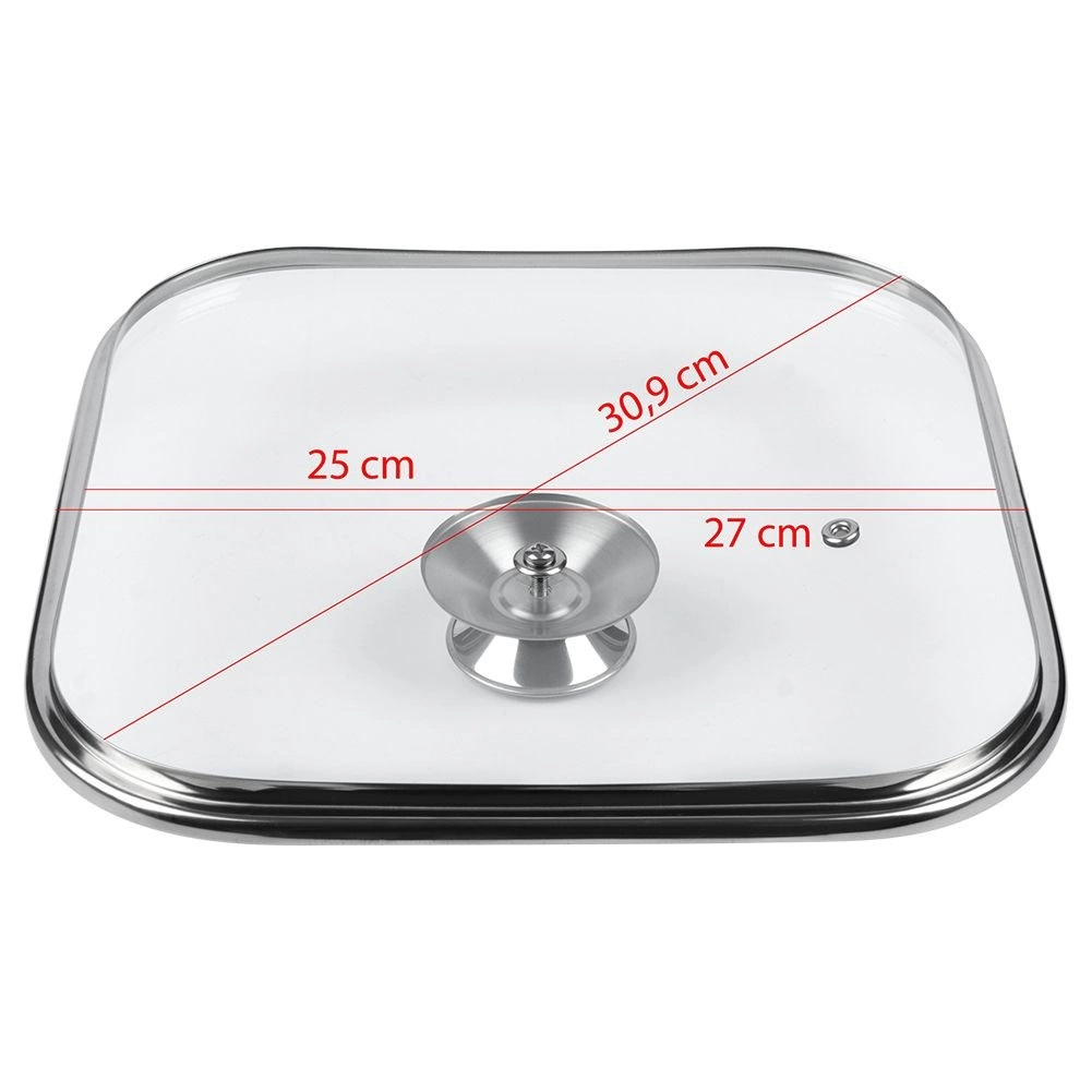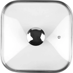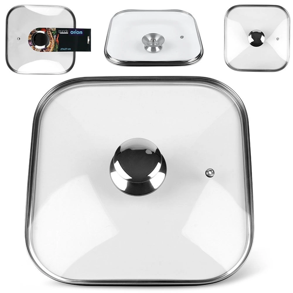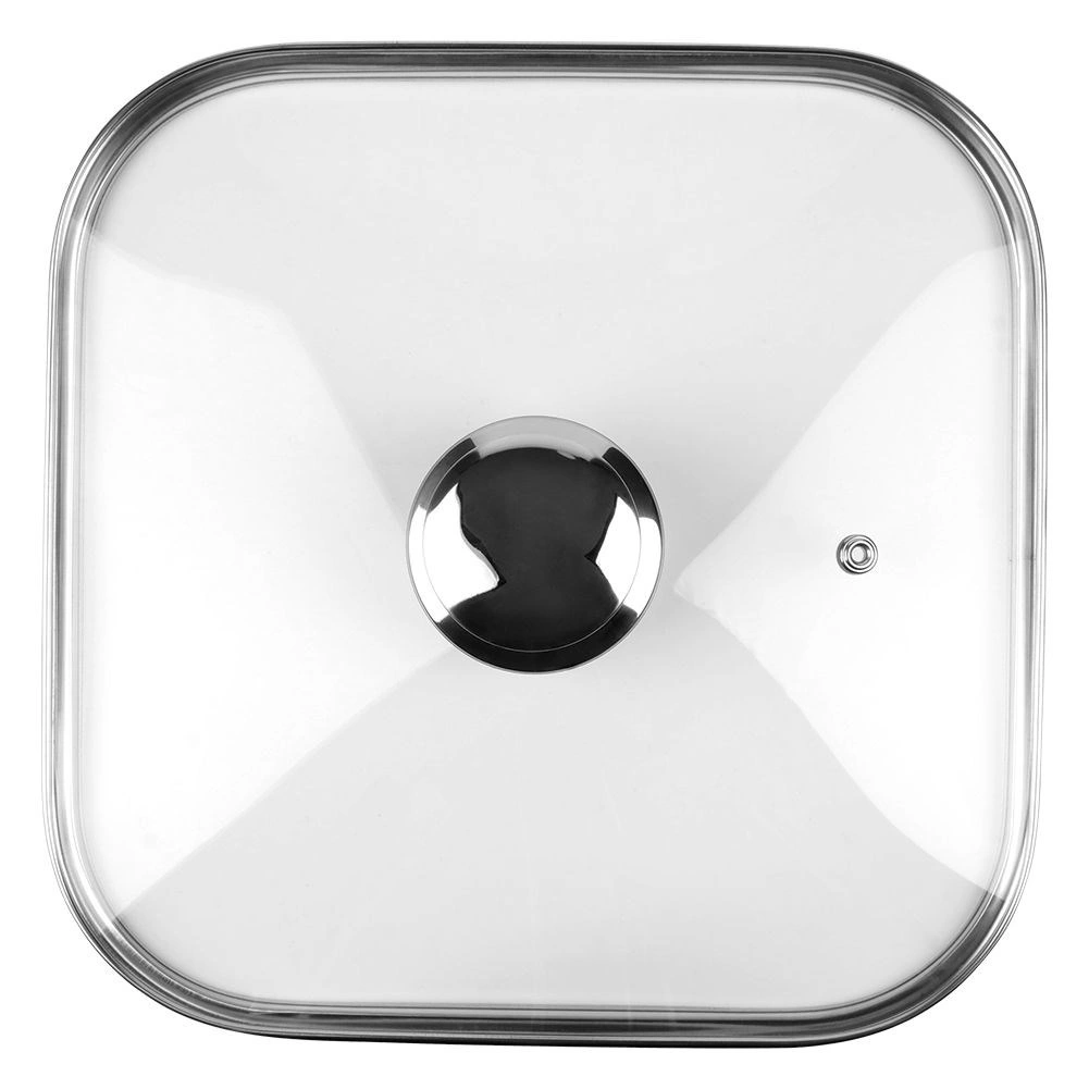 Couvercle carré universel en verre de 27 × 27 cm avec bord et poignée en inox, s’adapte parfaitement aux casseroles et poêles carrées. Le verre résistant à la chaleur permet de contrôler la cuisson sans soulever le couvercle, la valve vapeur évacue l’excès de vapeur et la légère convexité favorise la circulation de l’air chaud. Compatible lave-vaisselle, résistant jusqu’à 160 °C.