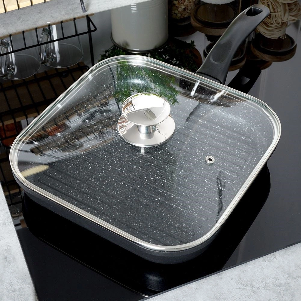 - Complète parfaitement poêles et casseroles sans couvercle ; convient aussi très bien à la poêle grill carrée