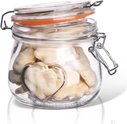 Bocal en verre universel 500 ml avec fermeture à clip et joint en caoutchouc pour garder les aliments frais plus longtemps. Fabriqué en verre épais avec un motif en relief de cœur, idéal pour le café, le thé, les épices, les petits fruits et les conserves maison. Dimensions 11 × 11 × 10 cm. Fermeture de qualité et étanche qui protège efficacement de l’humidité.
