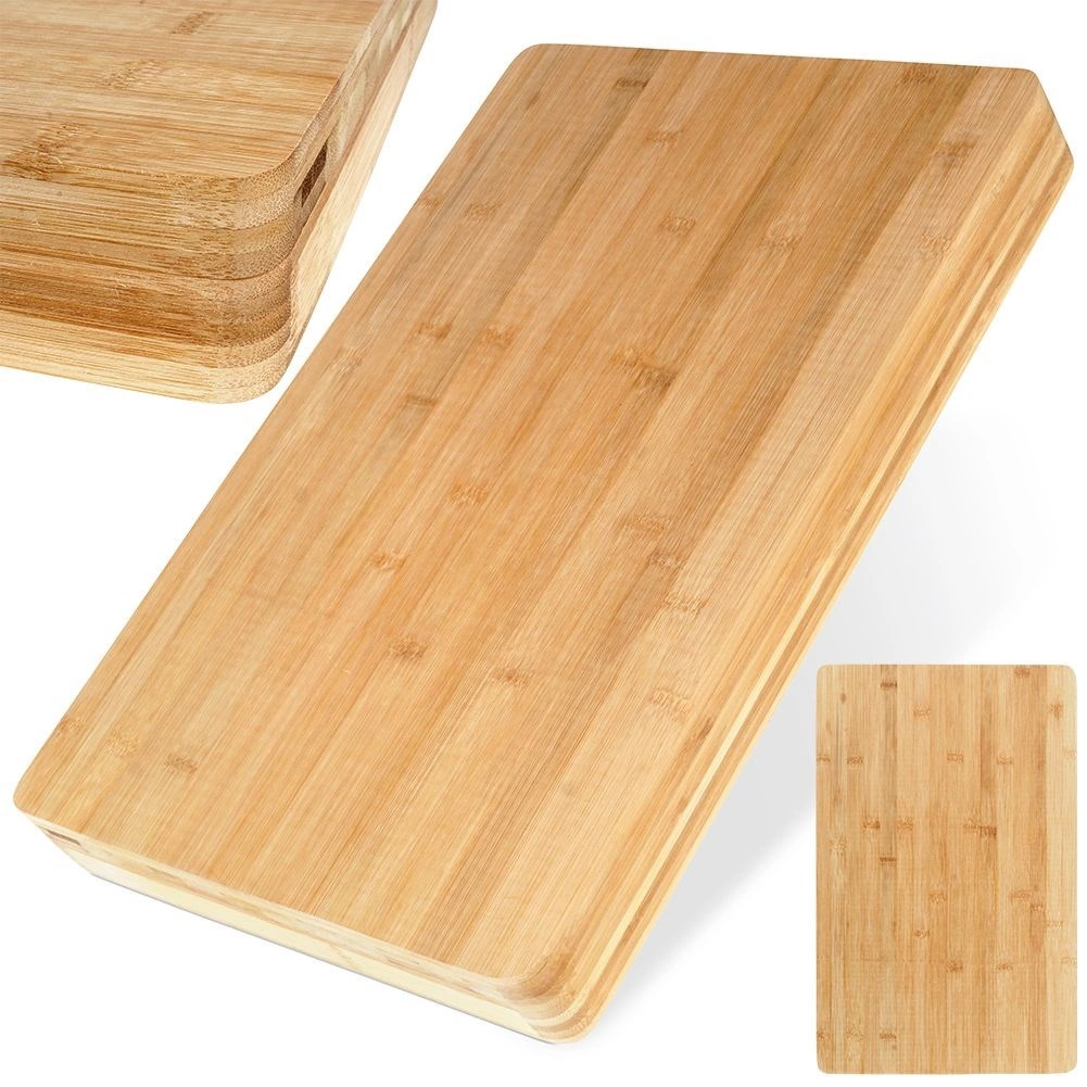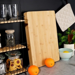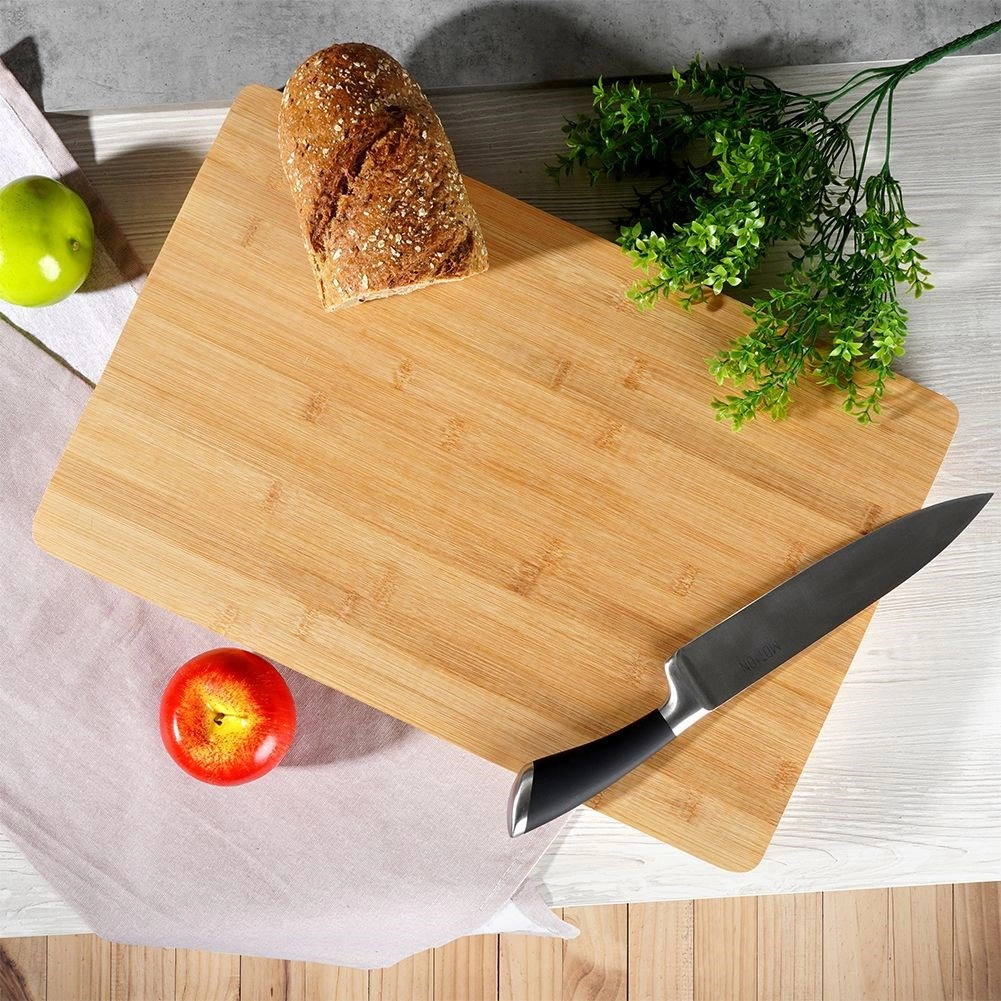 Planche à découper et à servir en bambou robuste, dimensions 46 × 30 cm, offrant une grande surface de travail, une haute résistance et une douceur pour les lames. Grâce au bambou naturel, elle est hygiénique, sèche rapidement et n’absorbe pas les odeurs – idéale pour toute cuisine et pour un service élégant.