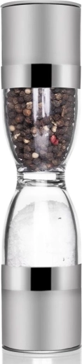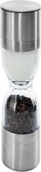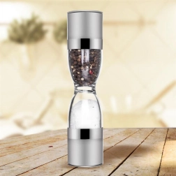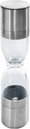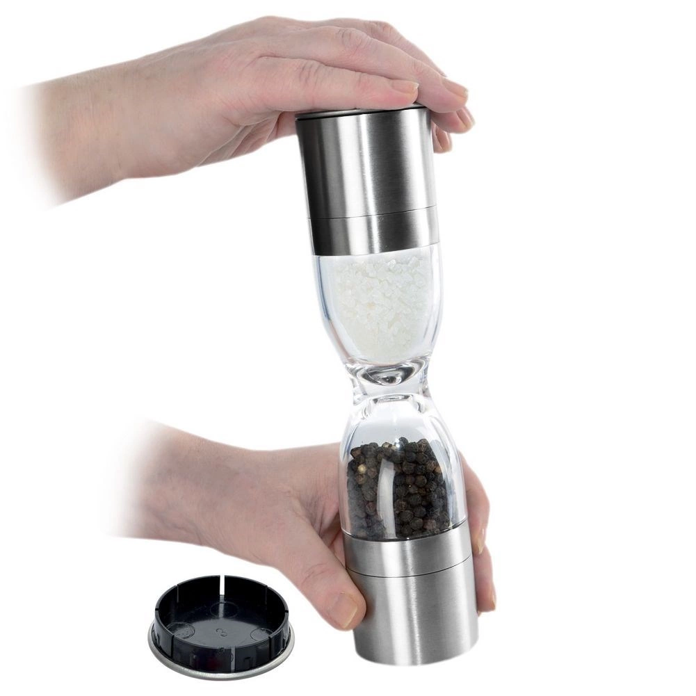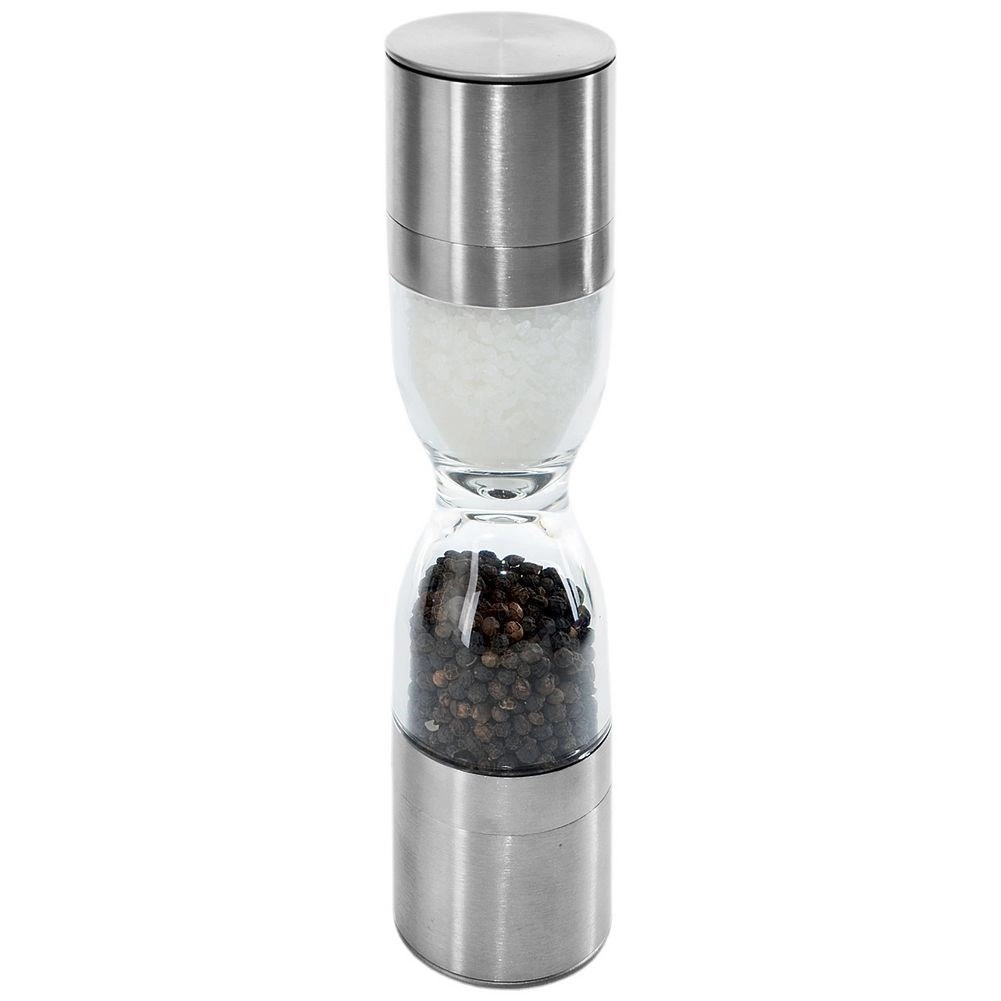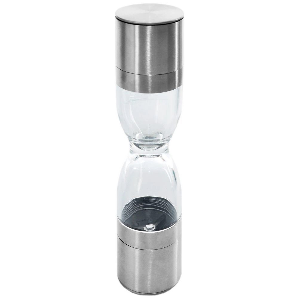 Élégant moulin à épices double en forme de sablier, combinant acier inoxydable, réservoirs transparents et mécanismes de broyage en céramique pour moudre avec précision le sel et le poivre. Offre une mouture réglable, deux chambres distinctes et des couvercles de protection contre les résidus. Un excellent allié pour toute cuisine et un accessoire de table élégant.