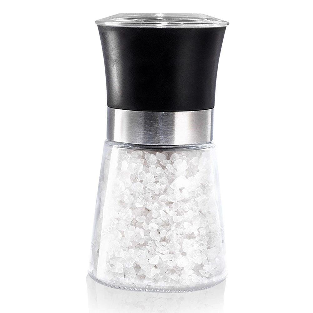 Moulin universel en verre pour sel, poivre et autres épices, hauteur 13 cm et diamètre 6,5 cm. Il offre un moulage manuel, un mécanisme de broyage en céramique pour les grains durs, une réglage de la mouture via une molette rotative et un couvercle anti-dispersion des résidus. Élégant, durable et facile à nettoyer – idéal pour la cuisine et la restauration.