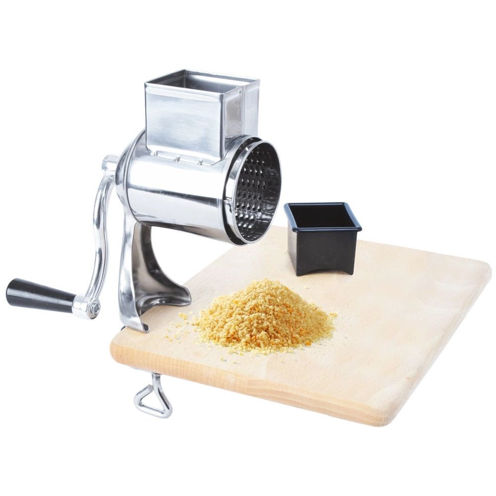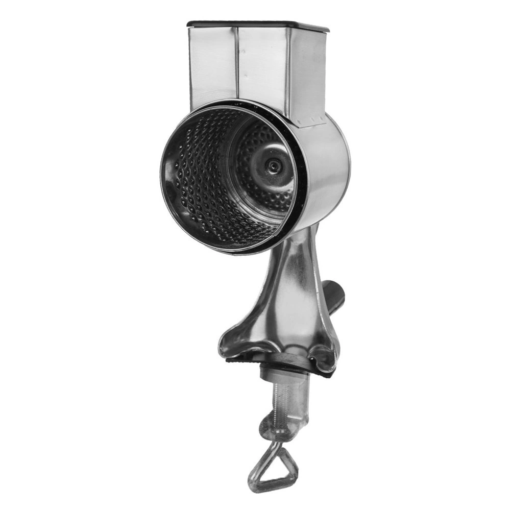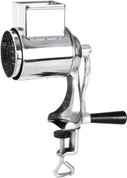 Râpe rotative manuelle pratique avec fixation à vis sur le plan de travail (épaisseur max. env. 3,5 cm) assurant une excellente stabilité lors de l’utilisation. Le corps en acier inoxydable combiné à un plastique durable et une manivelle confortable permettent un râpage fluide sans grande force. Le réservoir d’environ 6 × 5 cm accueille aisément les ingrédients pour un dosage continu.