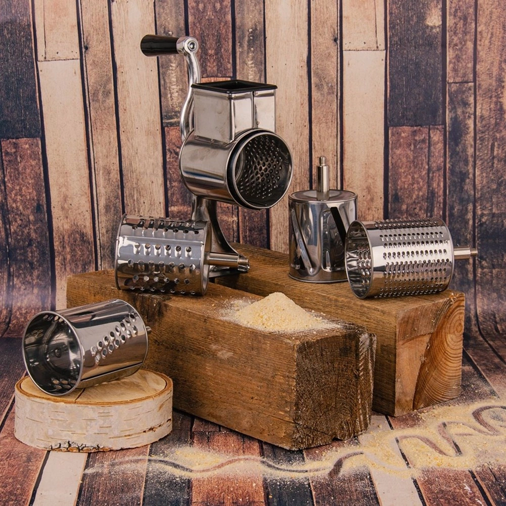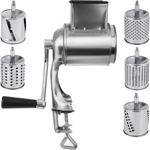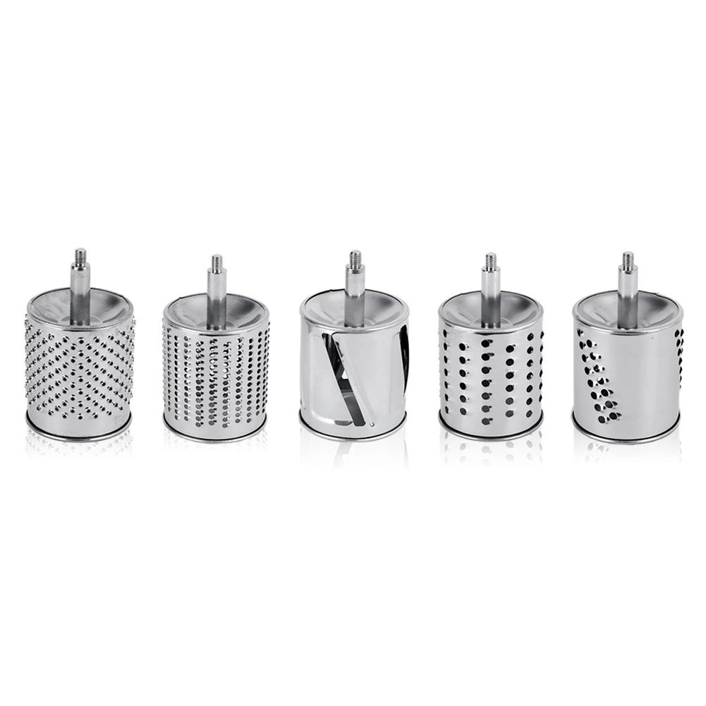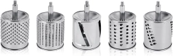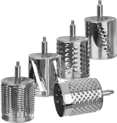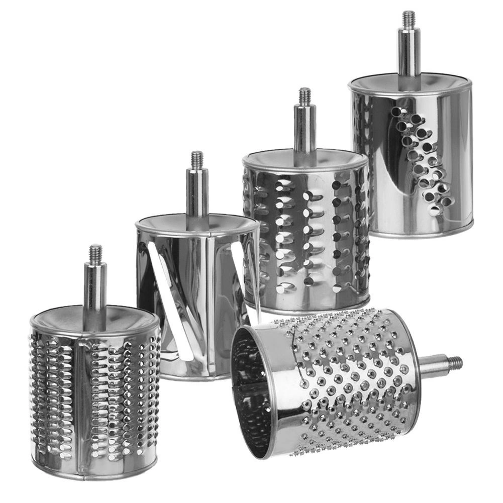 L’ensemble de 5 tambours en inox couvre le râpage fin et gros, le tranchage et le broyage. Idéal pour le fromage, les noix, le chocolat, les légumes et les fruits.