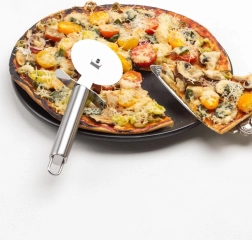 Pratique roulette à pizza en acier inoxydable de qualité avec lame de 7 cm de diamètre et longueur totale de 20,5 cm, pour une découpe nette et rapide. Grâce à la poignée ergonomique et au protège-doigts, le travail est maximisé en confort et en sécurité. Roue tranchante pivotante, construction tout métal et œillet de suspension pour un rangement facile.