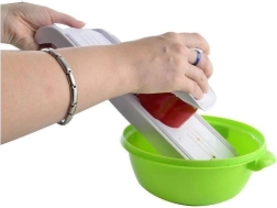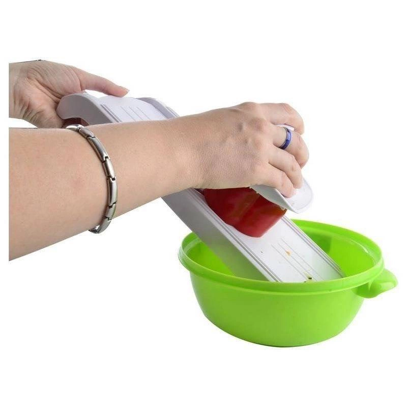 Pratique coupe-légumes et fruits de 36 × 12,5 × 4 cm offrant des embouts interchangeables pour trancher et râper, une lame en acier inoxydable affûtée et un poussoir de sécurité pour un travail confortable et sûr. Grâce à sa construction robuste, sa forme inclinée et son encoche pour s’appuyer sur le bord d’un bol, la découpe est rapide, précise et sans effort.