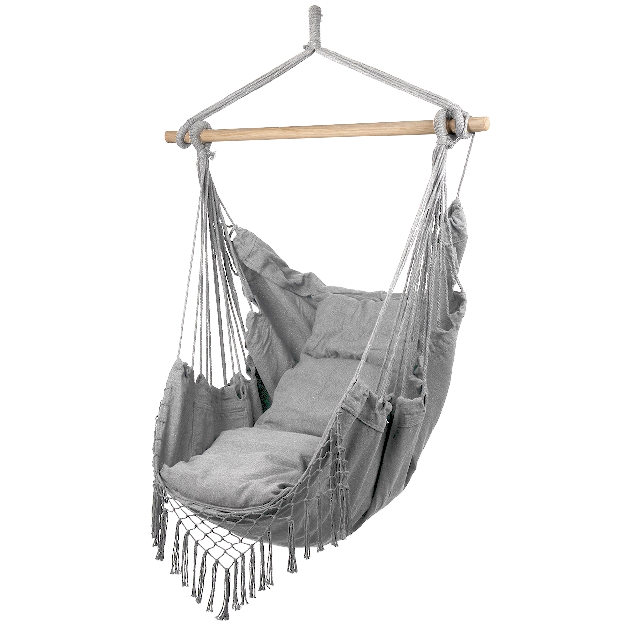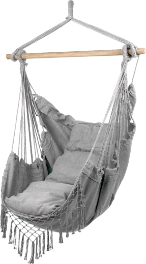 Ce fauteuil suspendu brésilien en coloris L.GRAY est idéal pour se détendre sur la terrasse, le balcon et à l’intérieur. Le mélange 65 % coton et 35 % polyester est agréable au toucher, respirant et résistant à un usage quotidien. La barre d’écartement en bois assure une assise confortable et une forme stable du fauteuil.