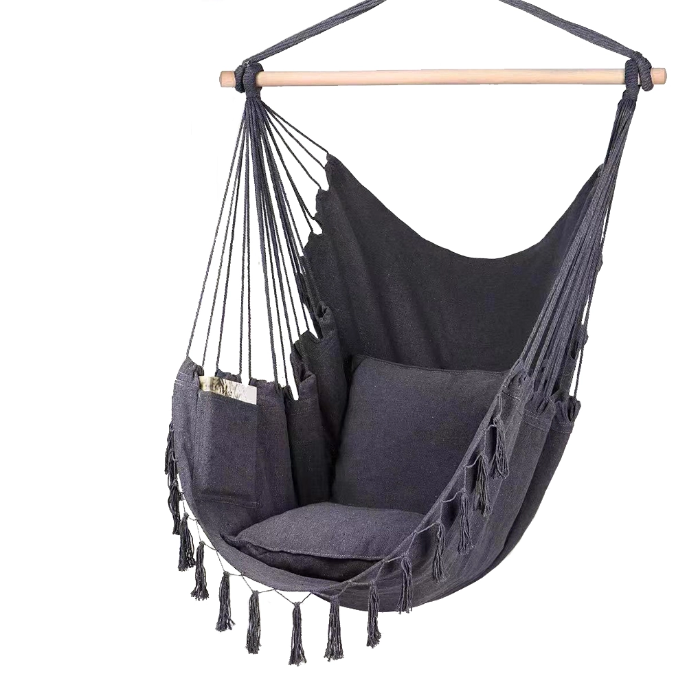 Le fauteuil suspendu brésilien MalTec allie confort, style et praticité. Grâce à la traverse en bois de 91 cm, l’assise est bien étalée et offre de la stabilité en position assise comme en balancement. Le coloris gris foncé s’accorde facilement avec les espaces intérieurs et extérieurs.