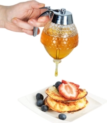 Pratique distributeur en verre pour miel et sirops, d’une capacité de 250 ml, avec socle, assurant un dosage précis, un service propre sans gouttes et une utilisation d’une seule main grâce à la gâchette intégrée à la poignée. Verre épais résistant, couvercle argenté et design élégant adaptés à toutes les tables et cuisines.
