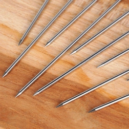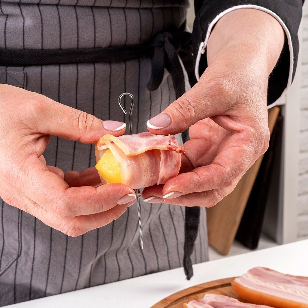 Avec ces brochettes universelles en inox, préparez des roulades et paupiettes sans fil et remplacez les cure-dents en bois jetables. L’œillet à l’extrémité facilite le piquage, le retrait et la manipulation, tout en empêchant les aliments de glisser.