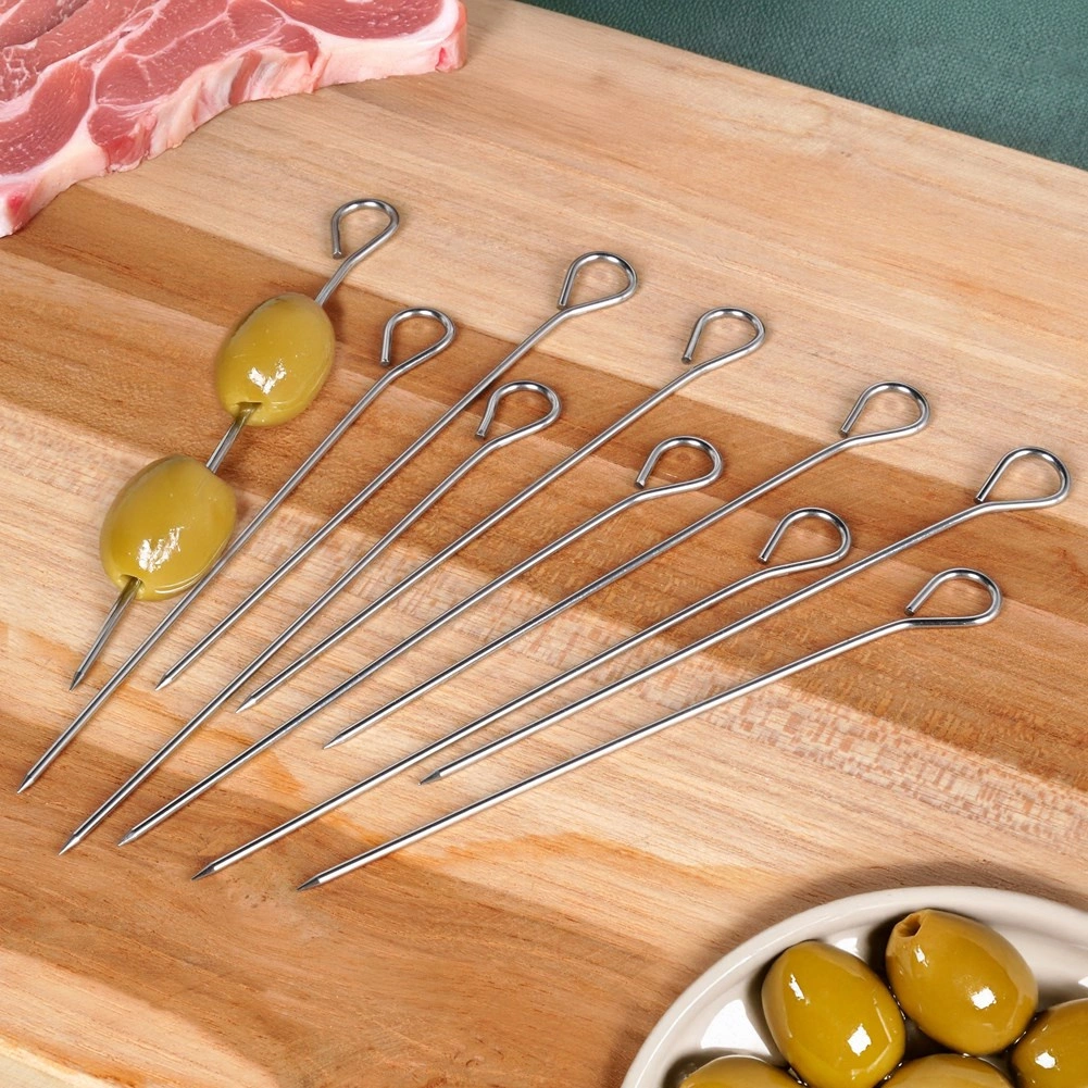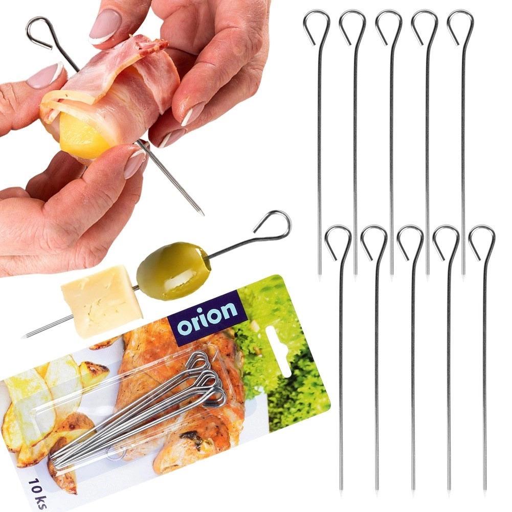 Pratique ensemble de 10 brochettes en acier inoxydable d’une longueur de 10 cm avec un œillet de préhension confortable. Idéal pour les roulades, paupiettes, zrazy, mais aussi comme pique élégant pour canapés, mini brochettes ou bouchées de fruits. Acier inoxydable résistant pour une longue durée de vie et un entretien facile.