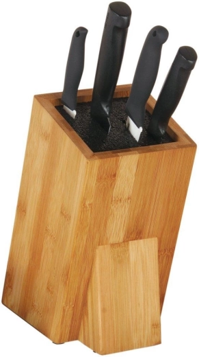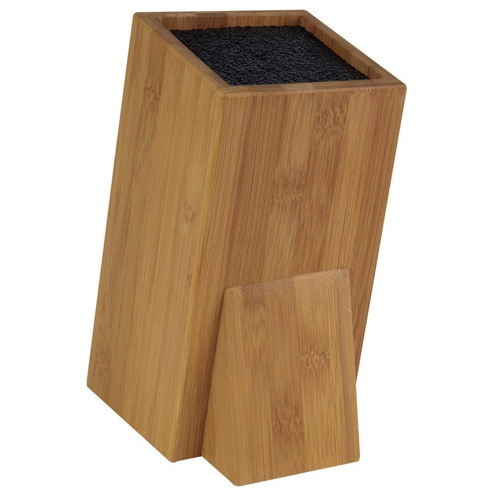 Élégant support à couteaux en bambou de 17 × 11,5 × 24,5 cm offrant un rangement universel et sécurisé pour tous types de couteaux de cuisine – acier, céramique et combinés. Grâce à son insert en fibres plastiques amovible, il s’adapte à différentes formes de lames sans risque d’émoussement, dispose de patins antidérapants pour une stabilité accrue et d’un design moderne qui s’harmonise parfaitement avec toute cuisine.