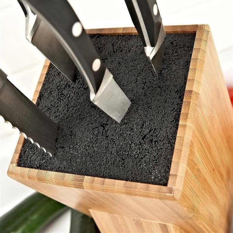 Des fibres plastiques denses, sans rainures fixes, accueillent les couteaux en acier ou en céramique, les ciseaux ou même des cuillères, tout en protégeant le tranchant contre l’émoussement.