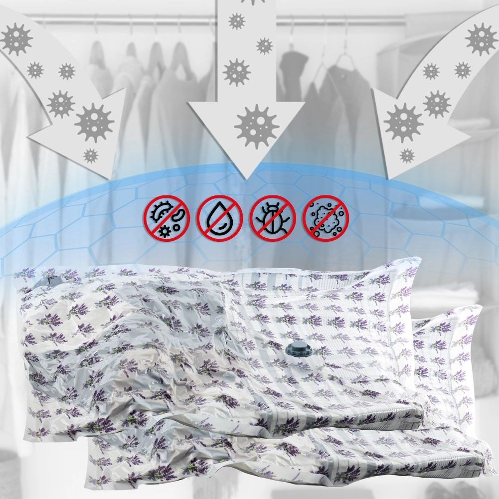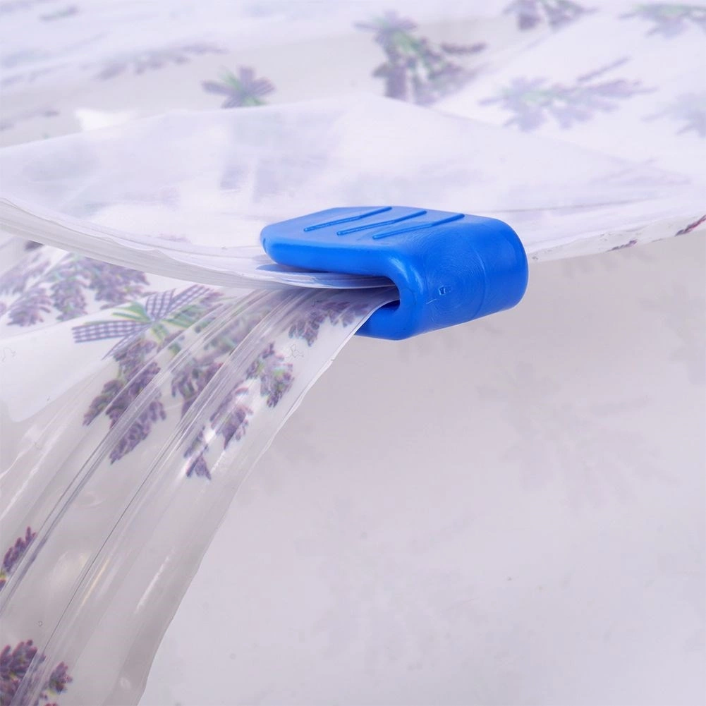 Le sac sous vide est idéal pour le rangement saisonnier des vêtements, housses de couette, couvertures et peluches. Fabriqué en film résistant à motif lavande, il permet une aspiration rapide de l’air à l’aide d’un aspirateur standard ou d’une pompe manuelle. En réduisant le volume, vous gagnez de la place dans les armoires, commodes et valises.