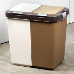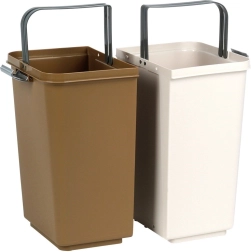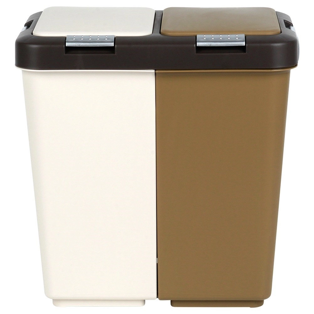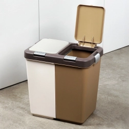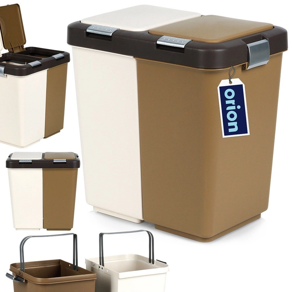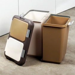 La poubelle est fabriquée en plastique résistant dans une combinaison de blanc et de brun, s’intégrant aux espaces modernes comme réduits. Ses dimensions compactes économisent plus d’espace que deux poubelles distinctes et limitent la propagation des odeurs grâce aux couvercles fermés.