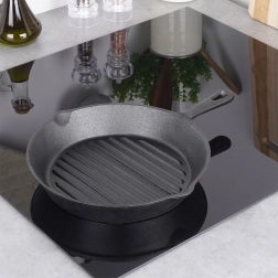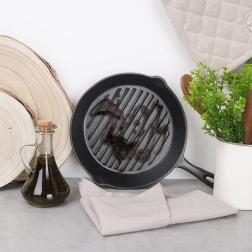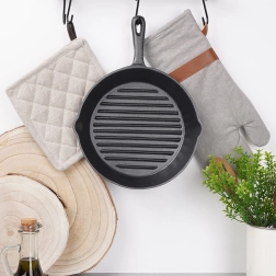 Cette poêle grill en fonte 24 cm est idéale pour saisir intensément, rôtir et griller. La fonte lourde chauffe uniformément et conserve longtemps la chaleur, gardant les plats chauds et juteux plus longtemps. La surface striée intérieure évacue l’excès de graisse et crée un marquage de grill attrayant.