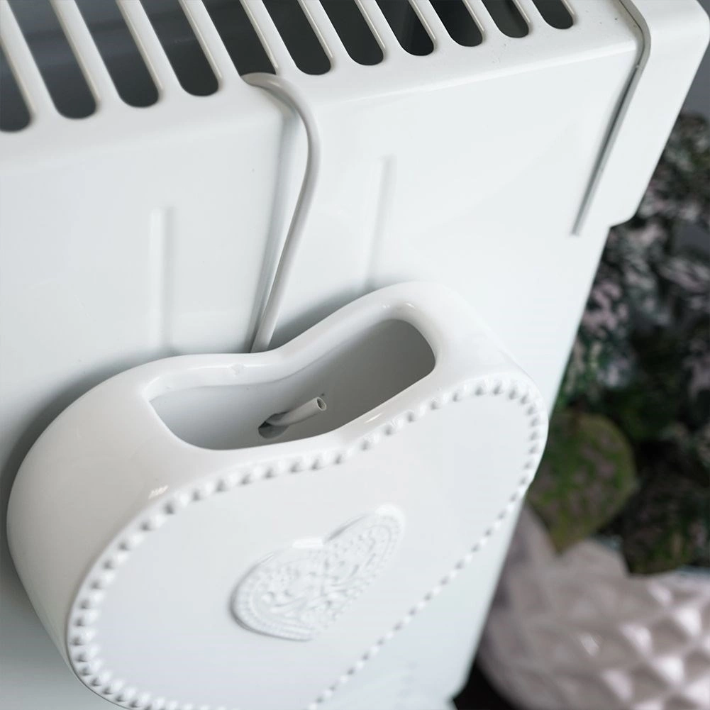 Cet humidificateur de radiateur en céramique blanche, avec un délicat relief de cœur, est une solution pratique contre l’air sec pendant la période de chauffage. Il suffit de le remplir d’eau et de le suspendre au radiateur à l’aide du crochet métallique – l’eau s’évapore progressivement et améliore le confort climatique de la pièce.