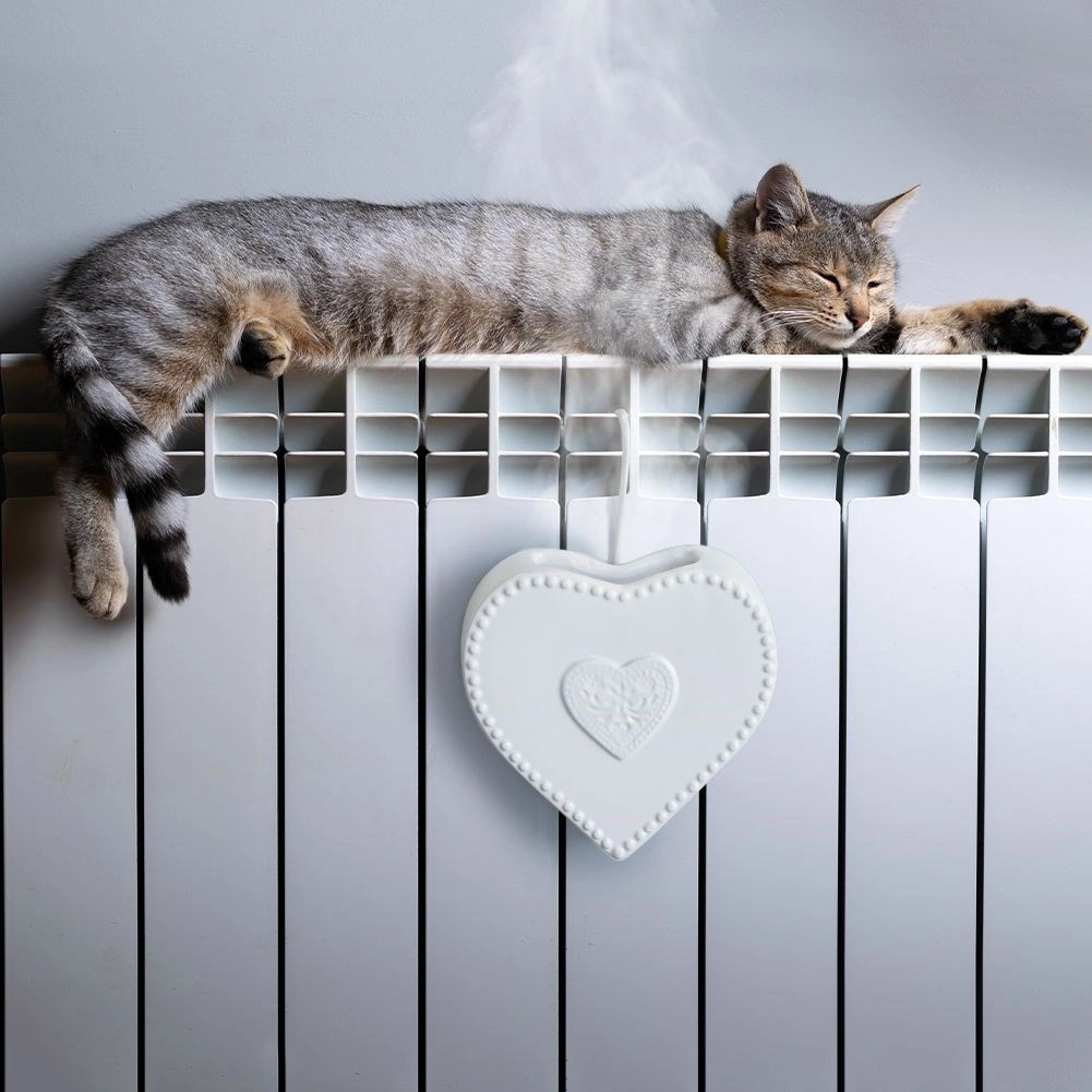 Élégant humidificateur d’air en céramique en forme de cœur à suspendre au radiateur. Grâce à sa capacité de 200 ml, il aide à maintenir une humidité optimale pendant la saison de chauffage, offre une finition brillante, une utilisation facile et sert de déco pour tout intérieur.