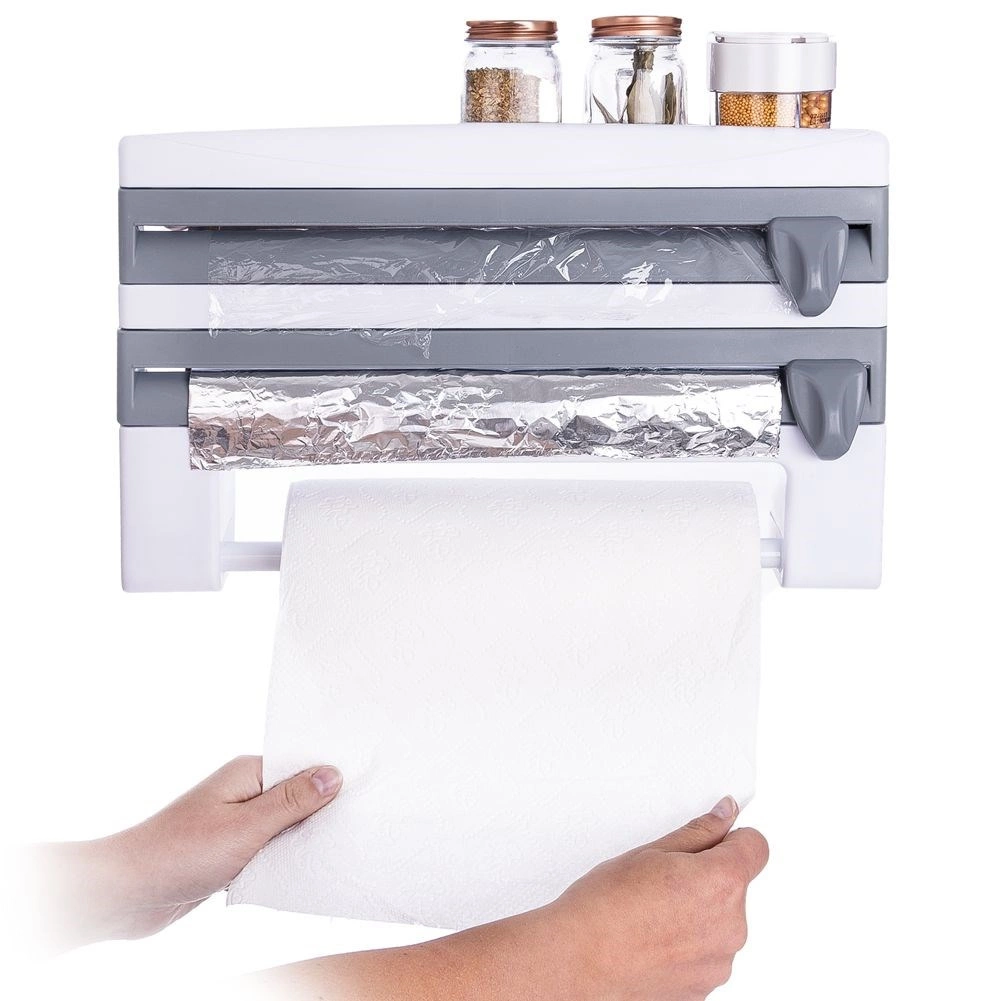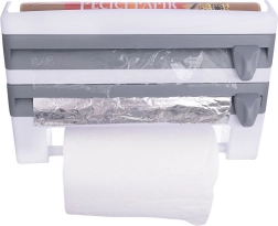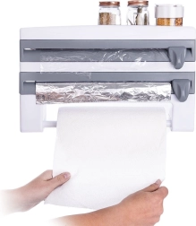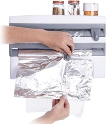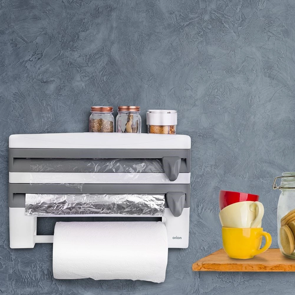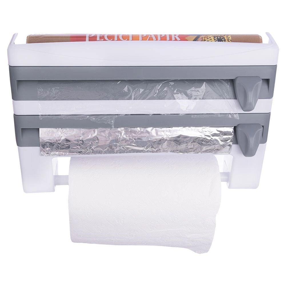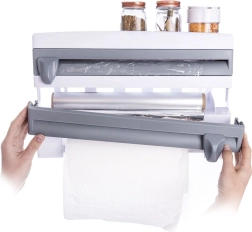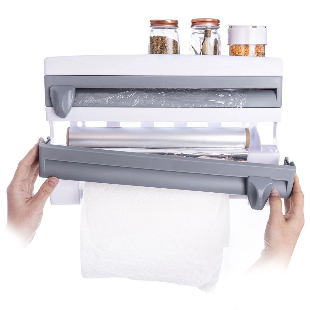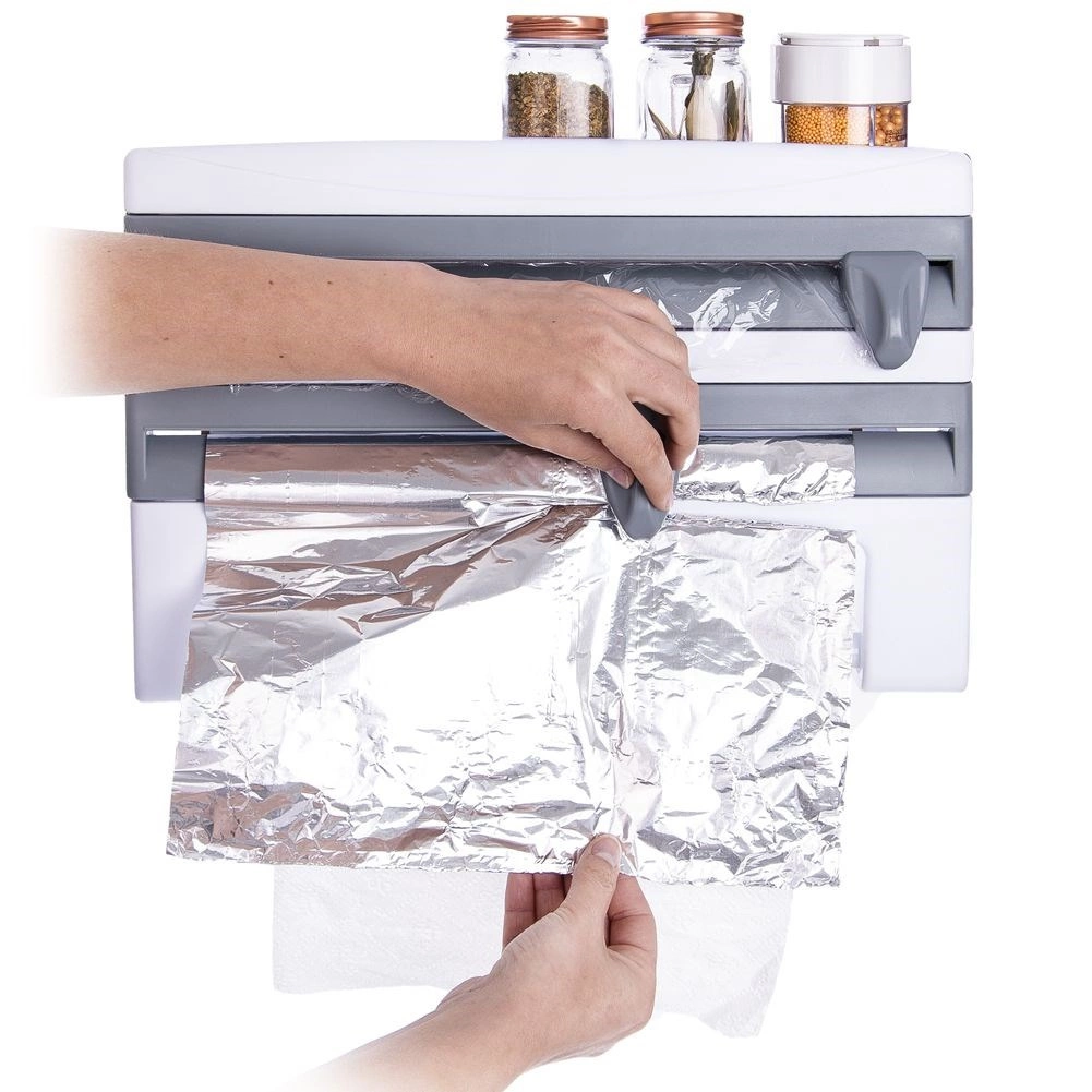 Le distributeur mural 3-en-1 pour films et essuie-tout est une solution intelligente pour toute cuisine domestique ou professionnelle. Deux compartiments séparés avec lames intégrées permettent un déroulement fluide et une coupe précise et sécurisée du film alimentaire et du film aluminium. La barre inférieure maintient un rouleau standard d’essuie-tout toujours à portée de main, tandis que la tablette supérieure offre de la place pour les épices, le papier cuisson ou de petits ustensiles.