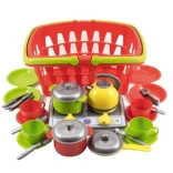 Comprend divers ustensiles de cuisine et vaisselle en rouge, vert et jaune, développant la créativité des enfants.