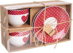 Élégant set de deux tasses en porcelaine avec soucoupes dans un emballage cadeau. Chaque tasse a une capacité de 280 ml et une anse confortable. Le blanc immaculé et le rouge avec un motif de pois blancs confèrent à l’ensemble un look élégant. Grâce à la fabrication en porcelaine de qualité, les tasses sont résistantes, compatibles lave-vaisselle et micro-ondes, et conviennent parfaitement pour le café comme le thé.