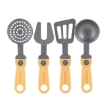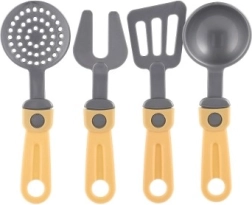 L'ensemble comprend trois casseroles avec couvercles et quatre outils de cuisine différents, idéal pour diverses activités culinaires imaginaires.